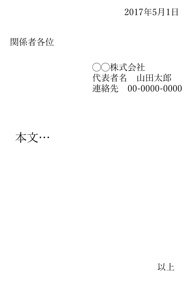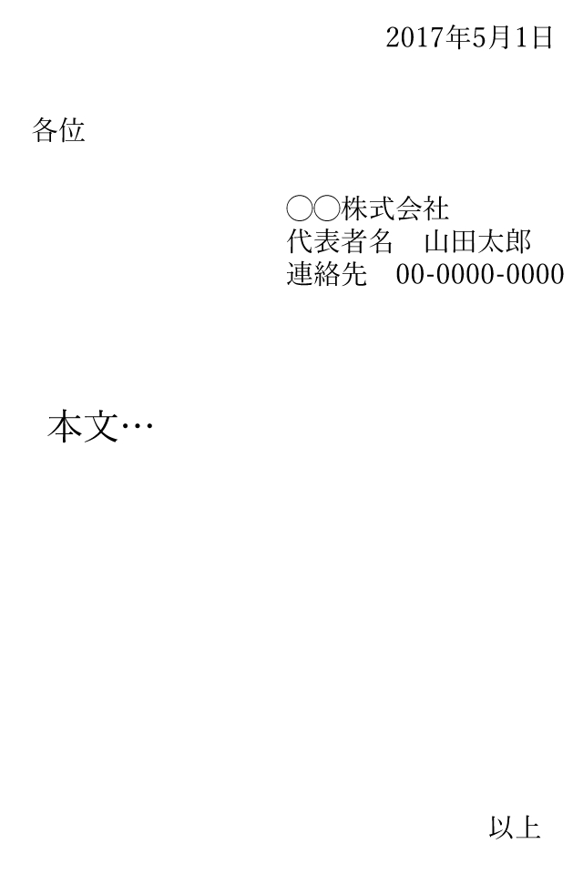 現代では、図のフォーマットのとおり日付、各位、社名という順番で下りてくる形式が一般的です。