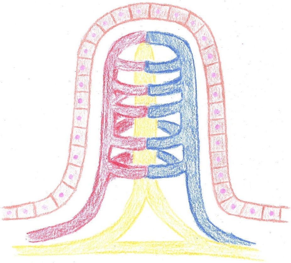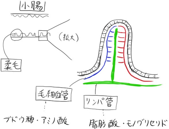 小腸の内壁は裏に毛細血管とリンパ管がある(上図では赤色と青色が血管、黄色がリンパ管)。