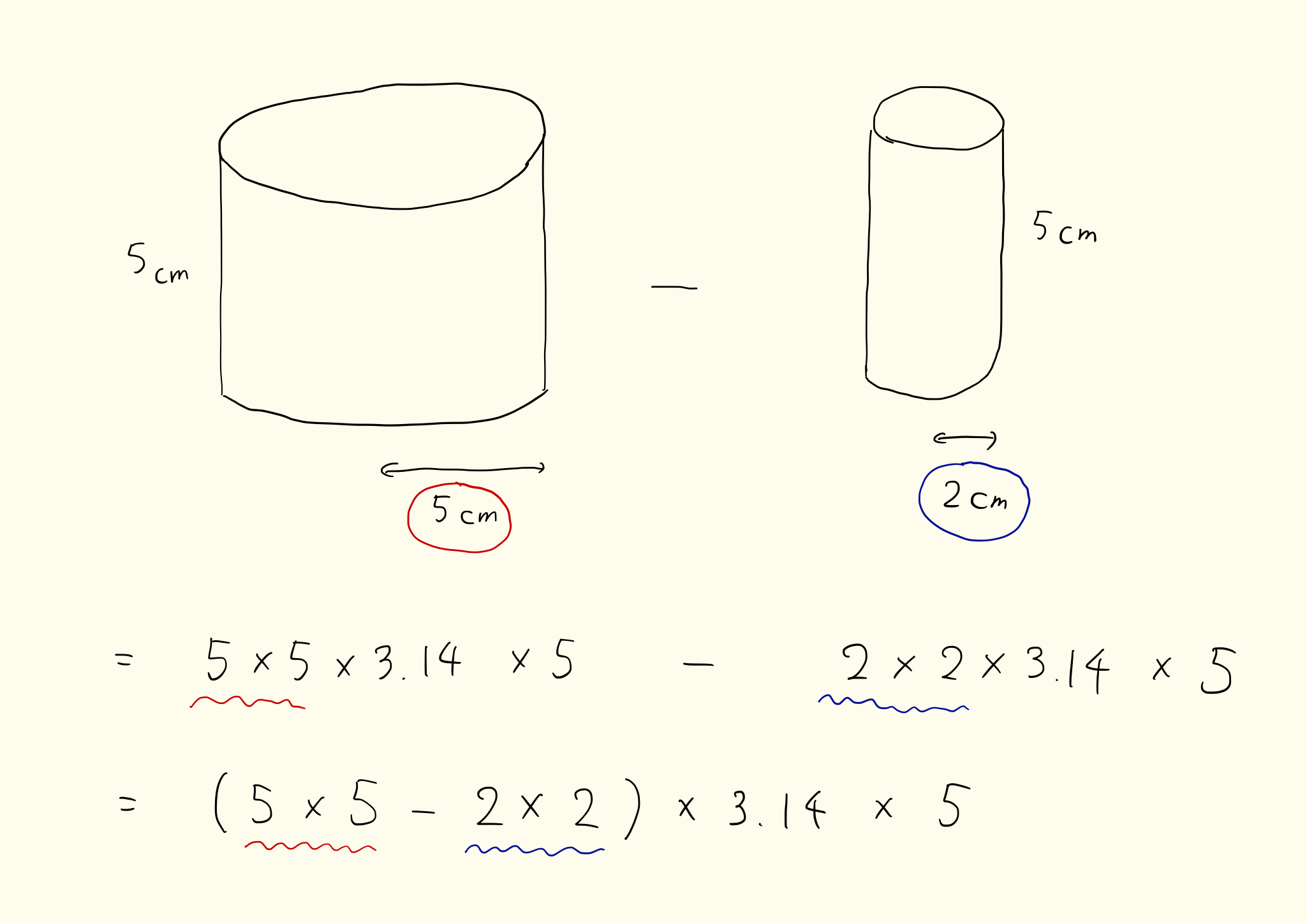 長方形を軸から離して回転させるとバームクーヘンができる。バームクーヘンの体積の公式:(長半径×長半径-短半径×短半径) × 高さ × 3.14