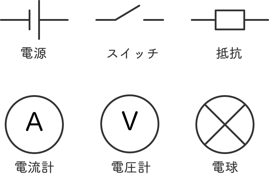 電源は縦線を 2 本並べた記号で表す。長いほうがプラス、短いほうがマイナス。電球は丸にバツ、電流計と電圧計はそれぞれ丸に A と V を入れて表す。
