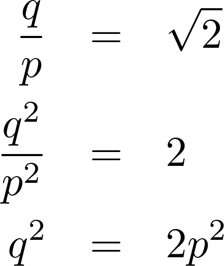 √2 = q/p とかけるとする。ここで p と q は互いの素の整数である。分数は分子と分母が互いに素になるまで約分できる。