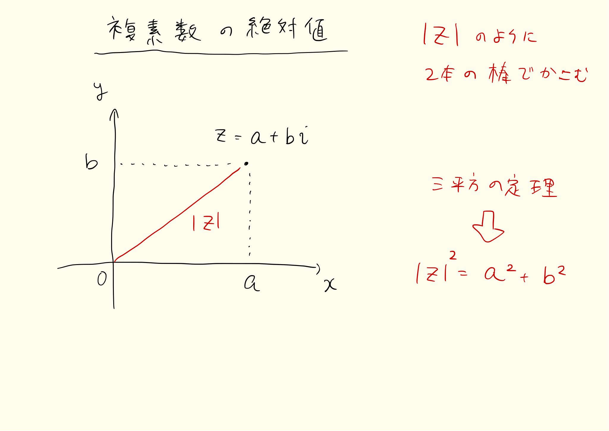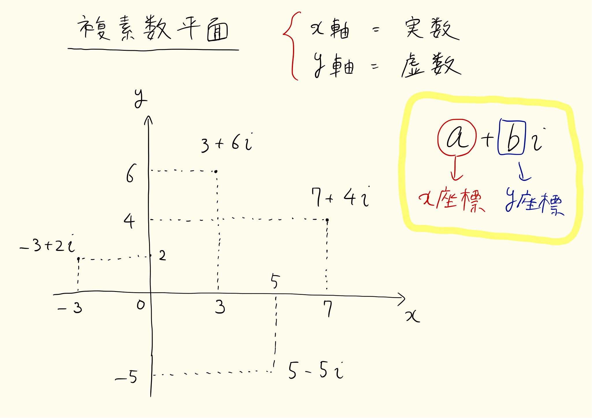 複素数平面は実数をx軸、虚数をy軸に表した座標です。(a,b)はa+biを表します。