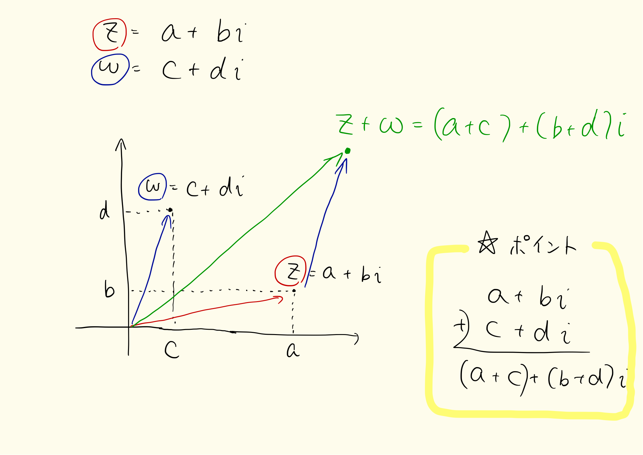 複素数の足し算は、複素数をベクトルとみなしたときの足し算に似ています。