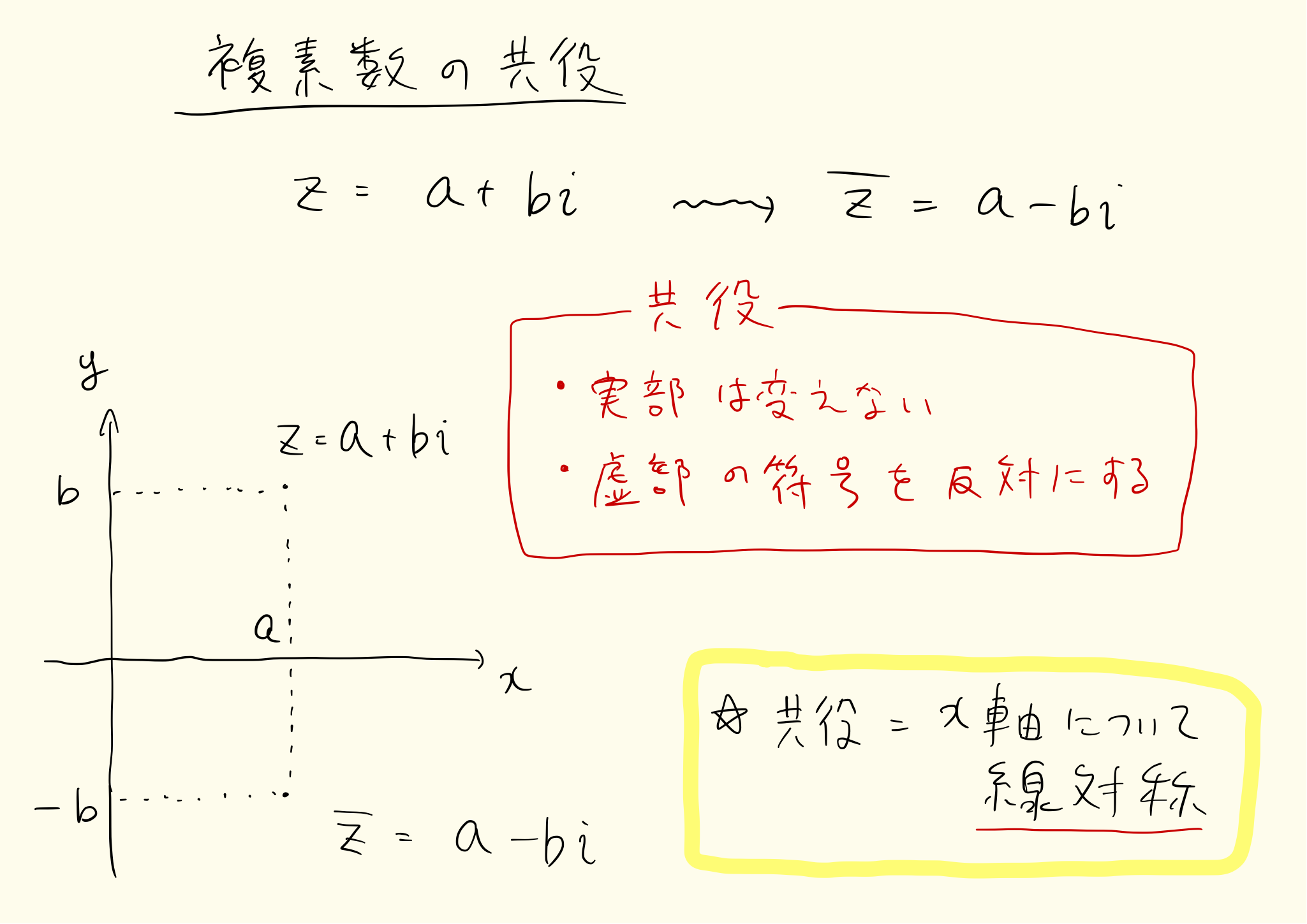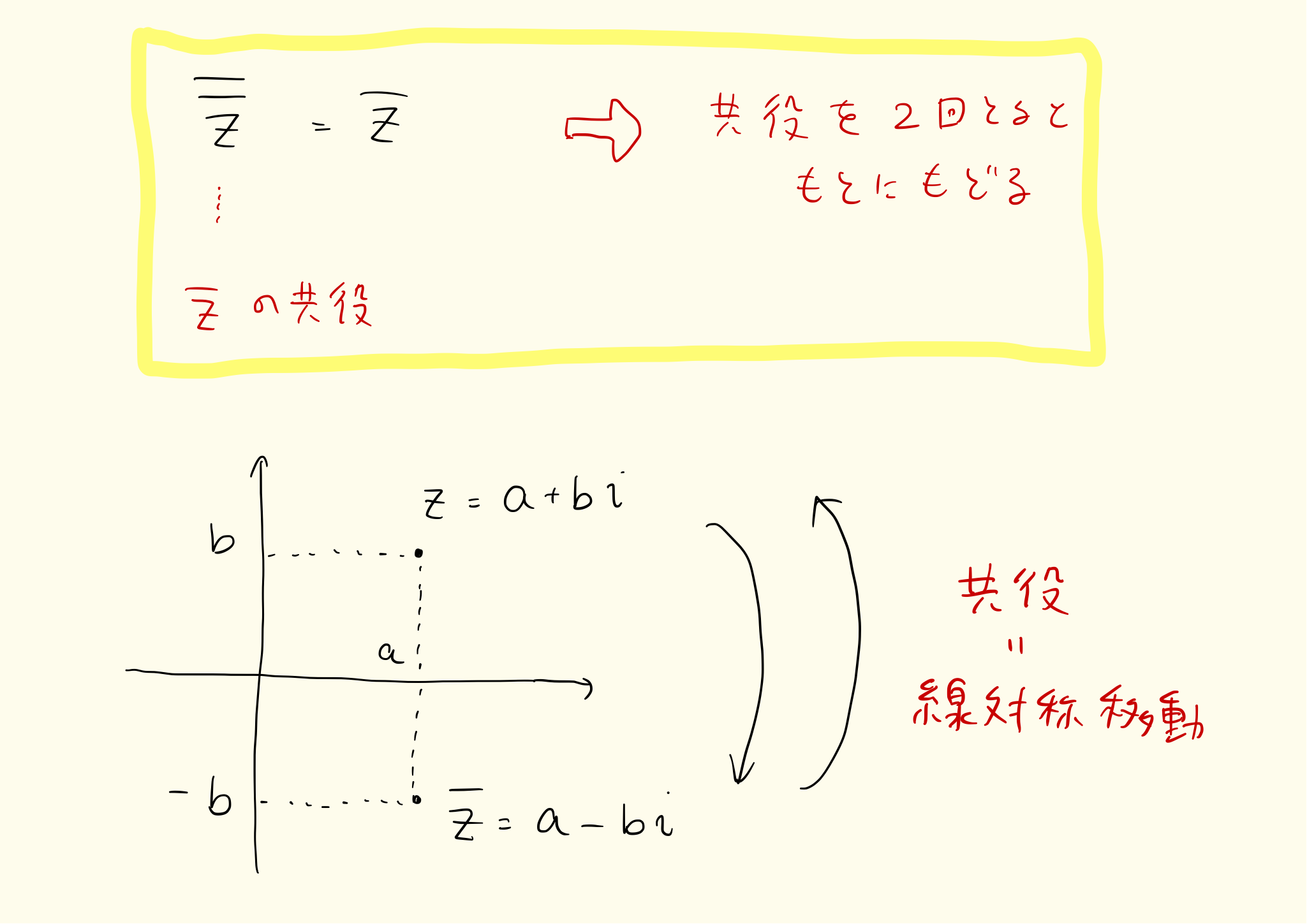 複素数の共役はx軸を軸とした線対称です。