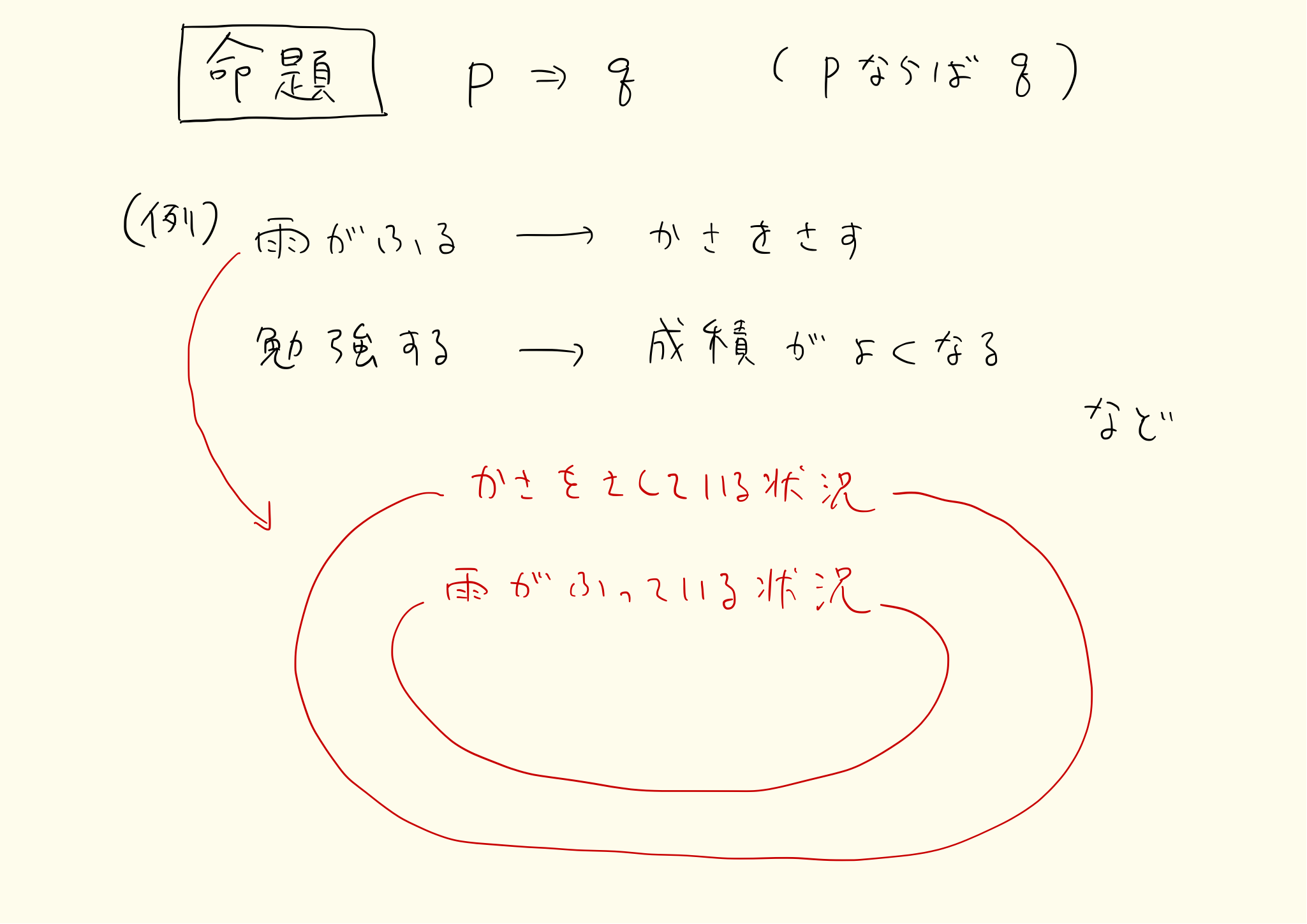 条件はpやqという記号で表します。例えば「雨が降ったら傘をさす」は「雨が降る」と「傘をさす」の二つがくっついた文です。この二つを条件といいます。「雨が降る」をp、「傘をさす」をqとすると