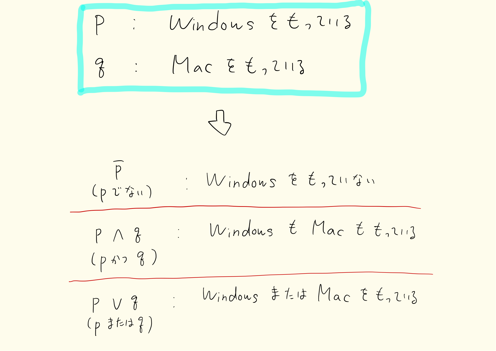 pかつqはわかりやすいと思いますが、pまたはqは少しわかりにくいかもしれません。pまたはqは最低限どちらかを持っているという意味です。両方持っている人もこれに当たります。つまりpまたはqはpかつqを含んだ概念です。