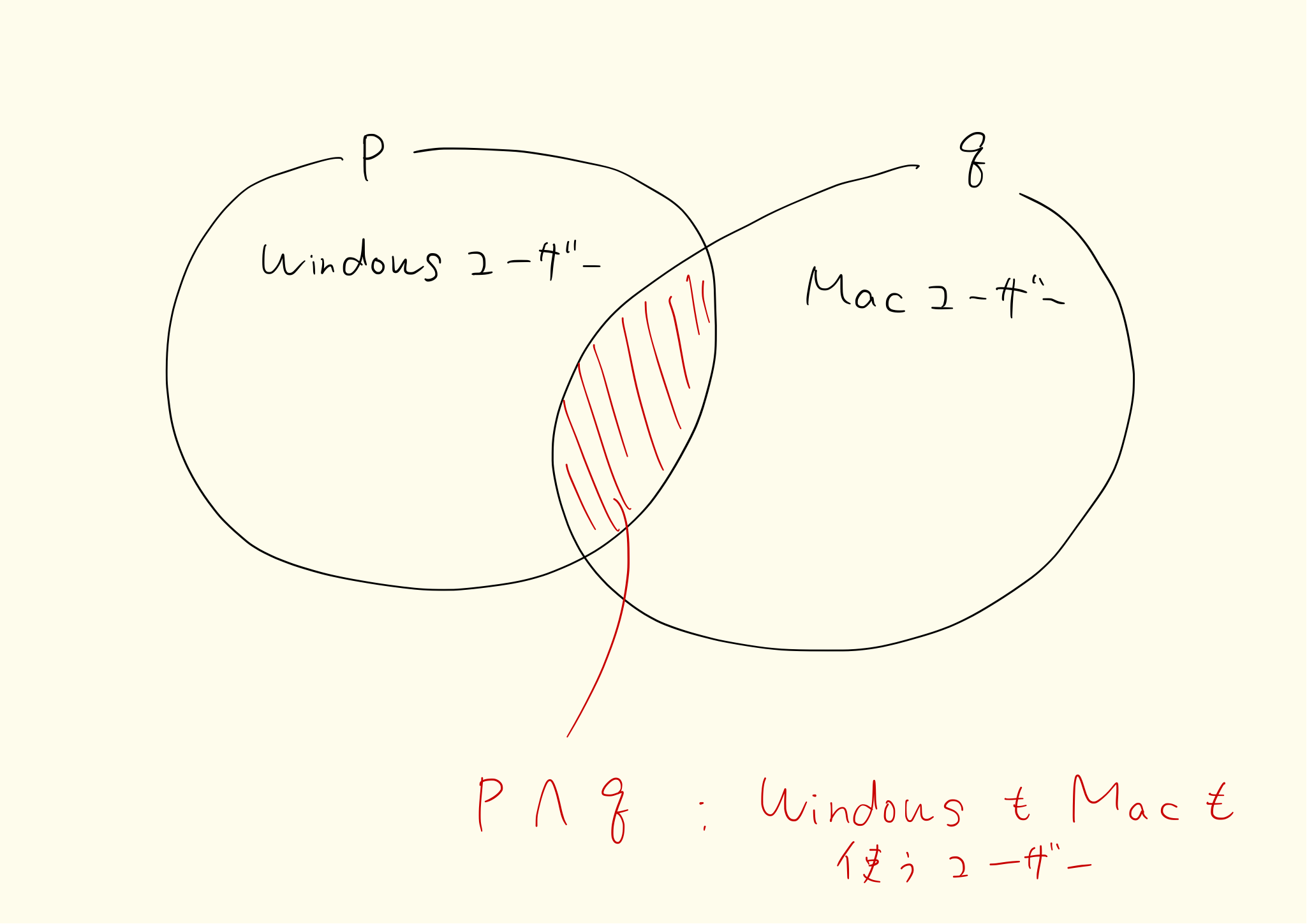 pとqをそれぞれ「Windowsを持っている」「Macを持っている」とします。このときpでない、pかつq、pまたはqは上図のようになります。