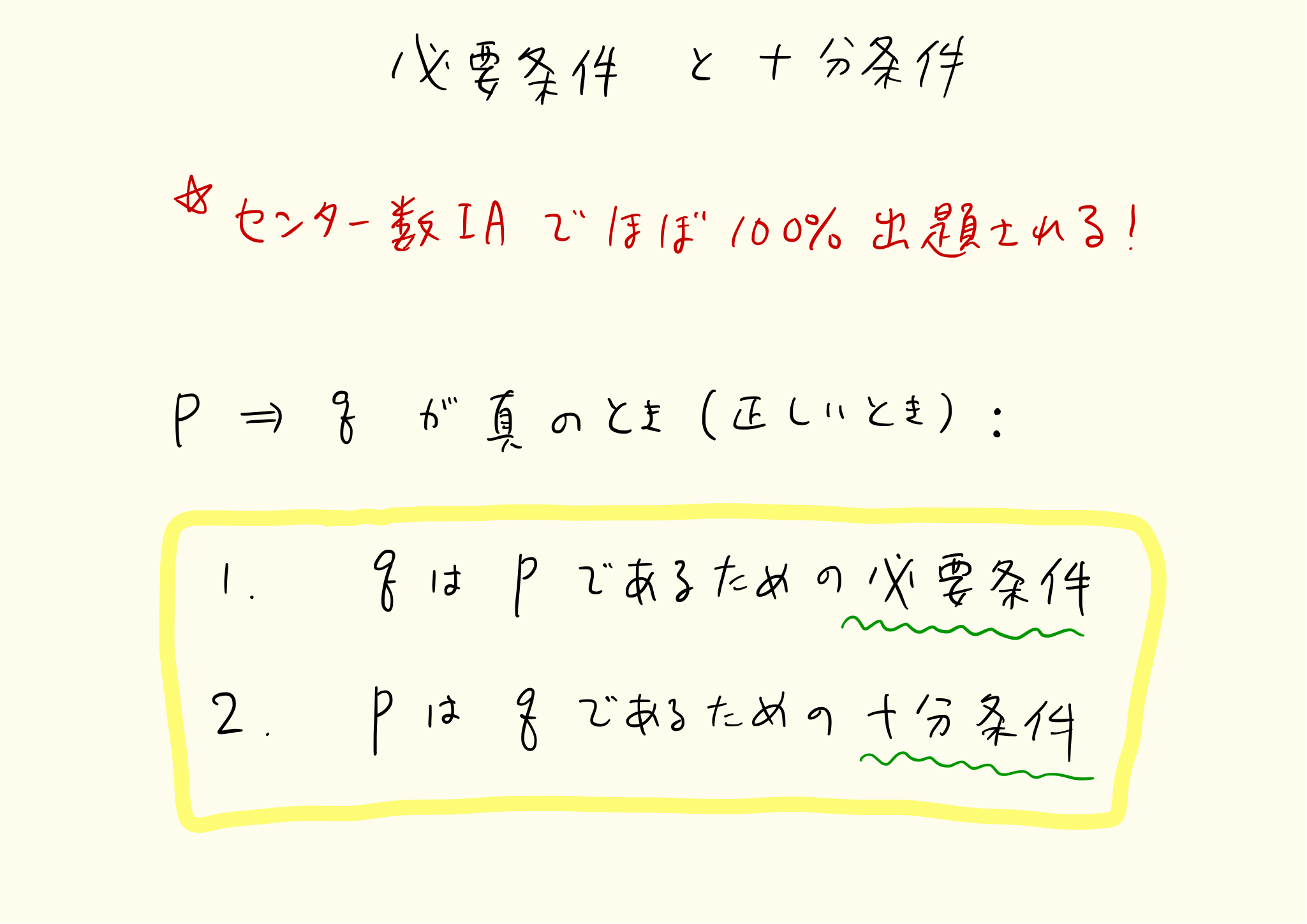 高校数学Ⅰの命題と条件について解説します。命題と条件、特に必要条件と十分条件はセンターの数学で必ず出るところです。この記事を読んでぜひ理解してください。