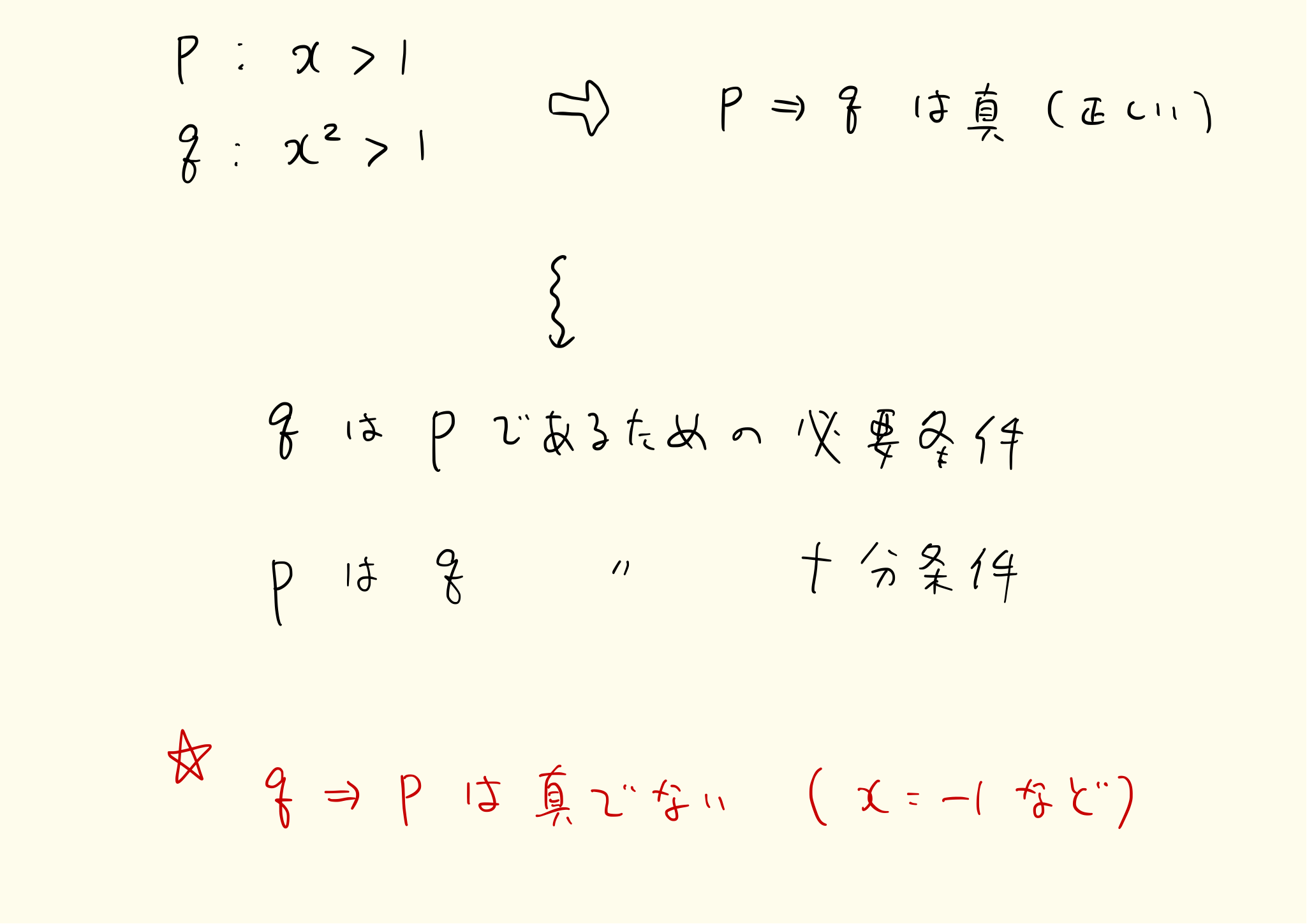 p→qが真実のとき、qはpであるための必要条件といいます。逆にpはqであるための十分条件といいます。