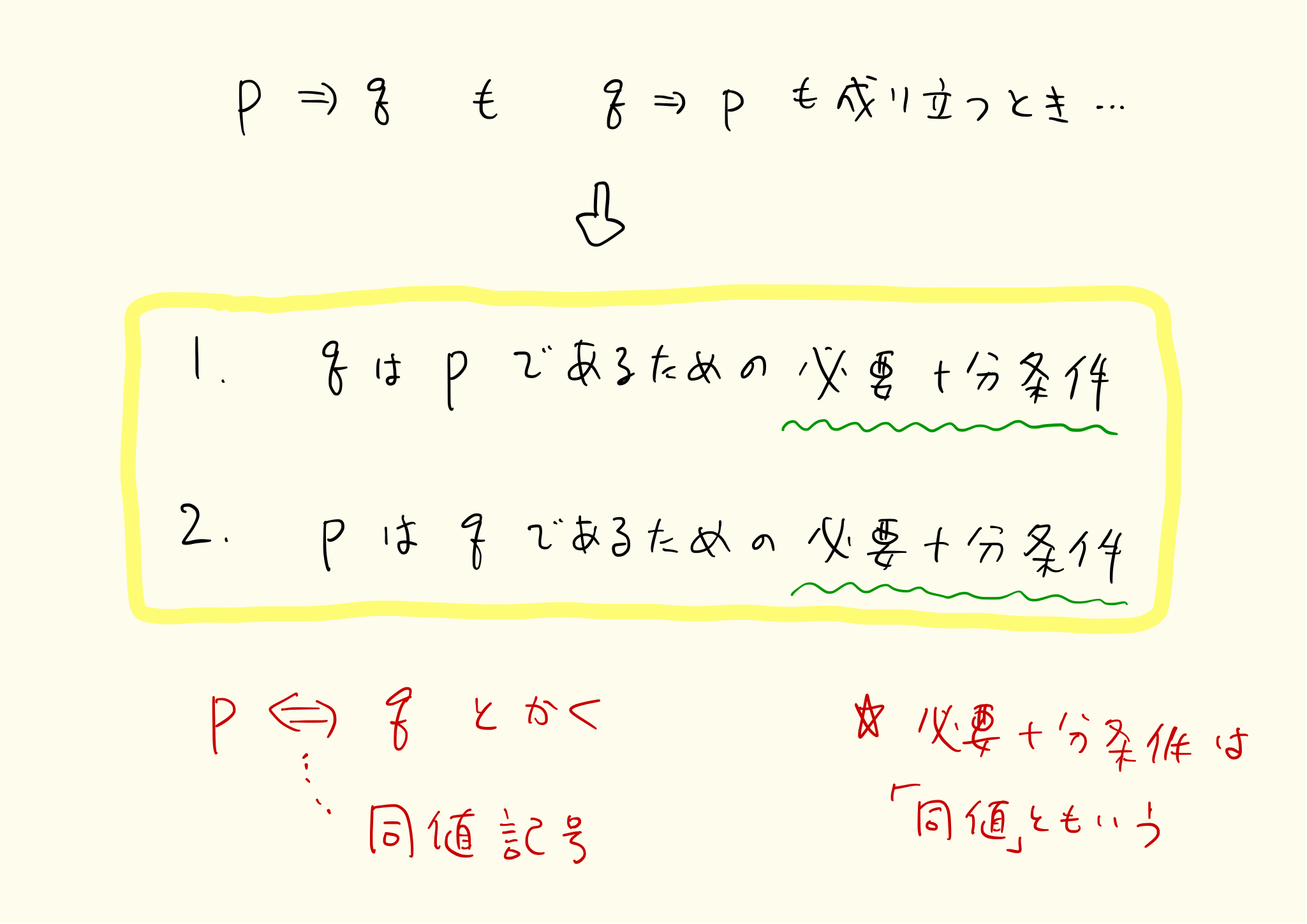p→qもq→pも正しいとき、qはpであるための必要十分条件といいます。