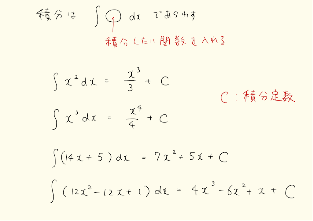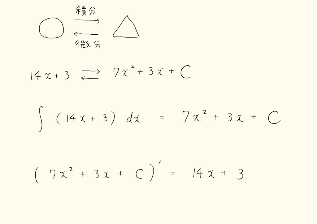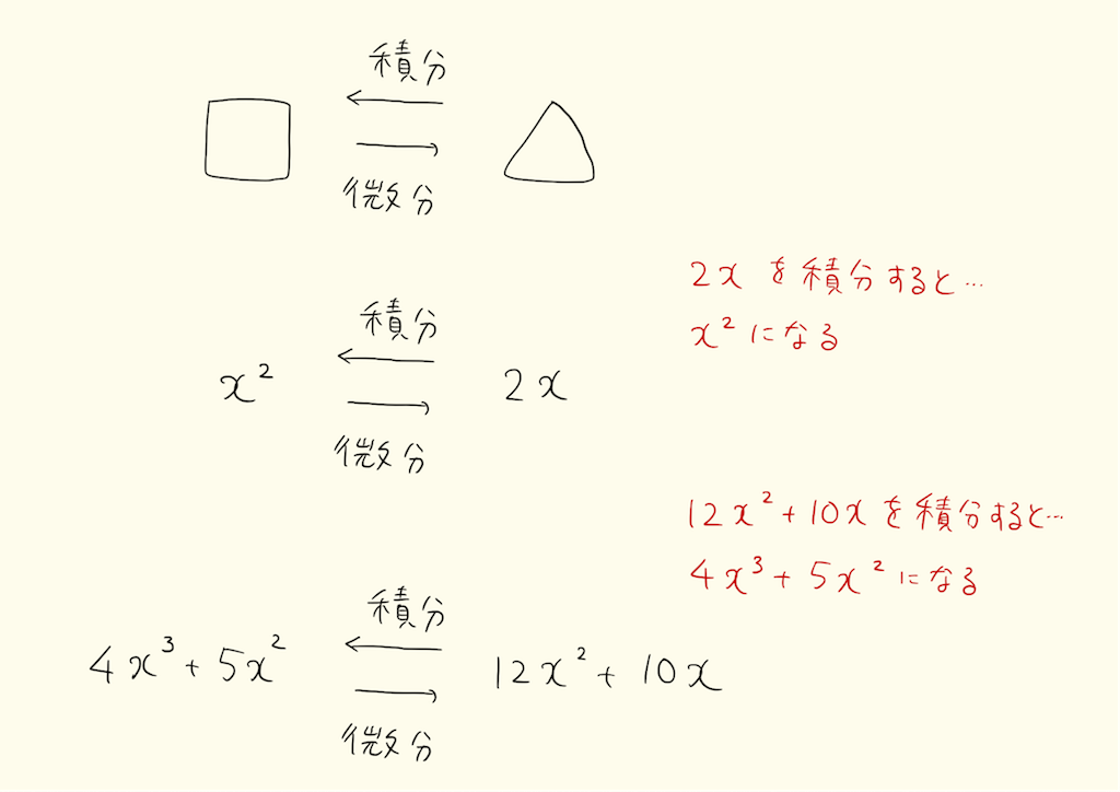 積分は微分の反対です。x^2を微分すると2xになり、2xを積分するとx^2になります。○を積分した関数は、その関数を微分して○になる関数です。