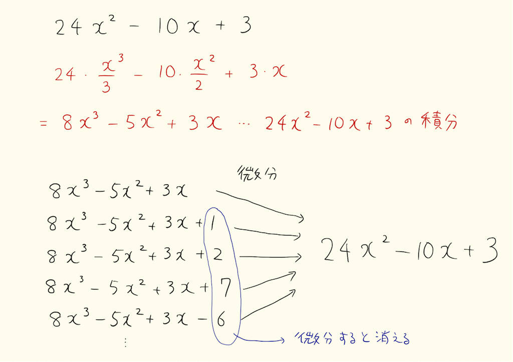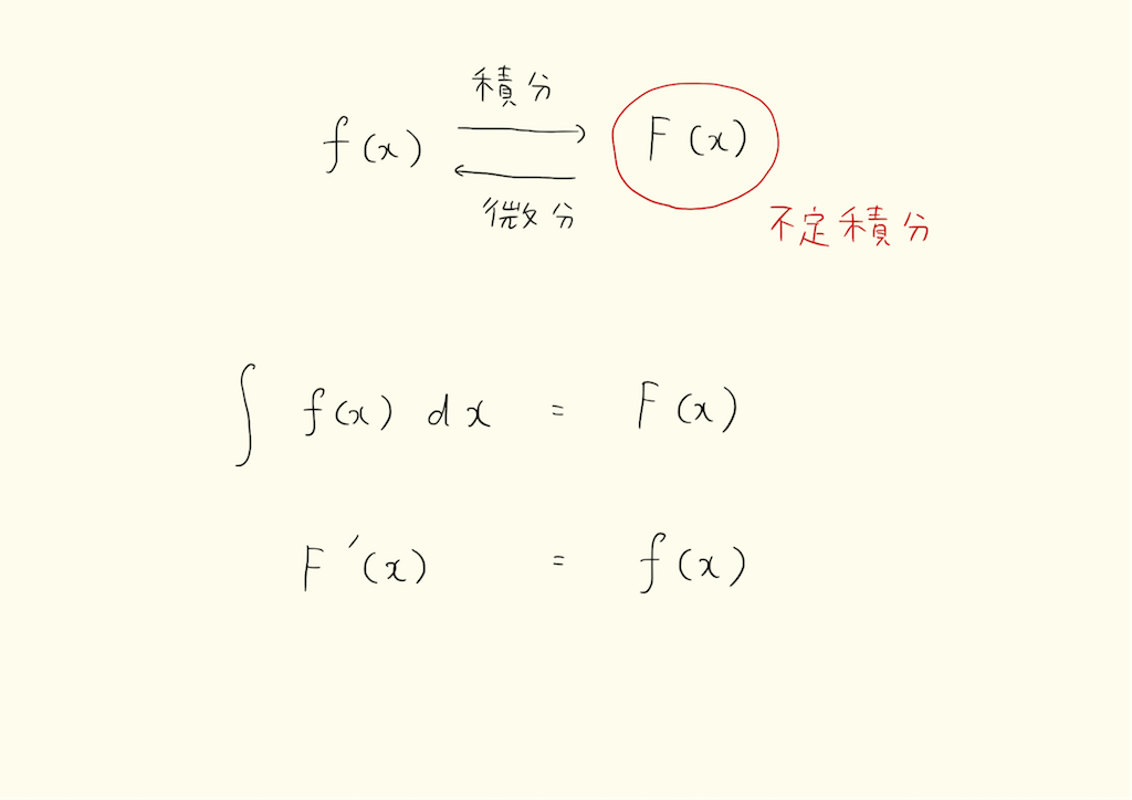 積分は微分の逆です。微分した関数を積分すると元に戻り、積分した関数を微分すると元に戻ります。