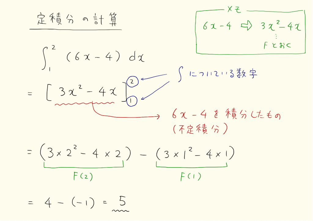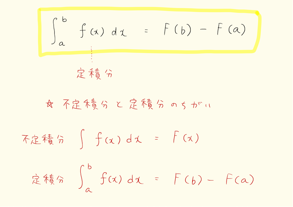 不定積分のxにaとbを代入したF(a)とF(b)の差を定積分とする。不定積分は関数、定積分は値になることに注意しよう。上下の添字がないと定積分は計算できない。