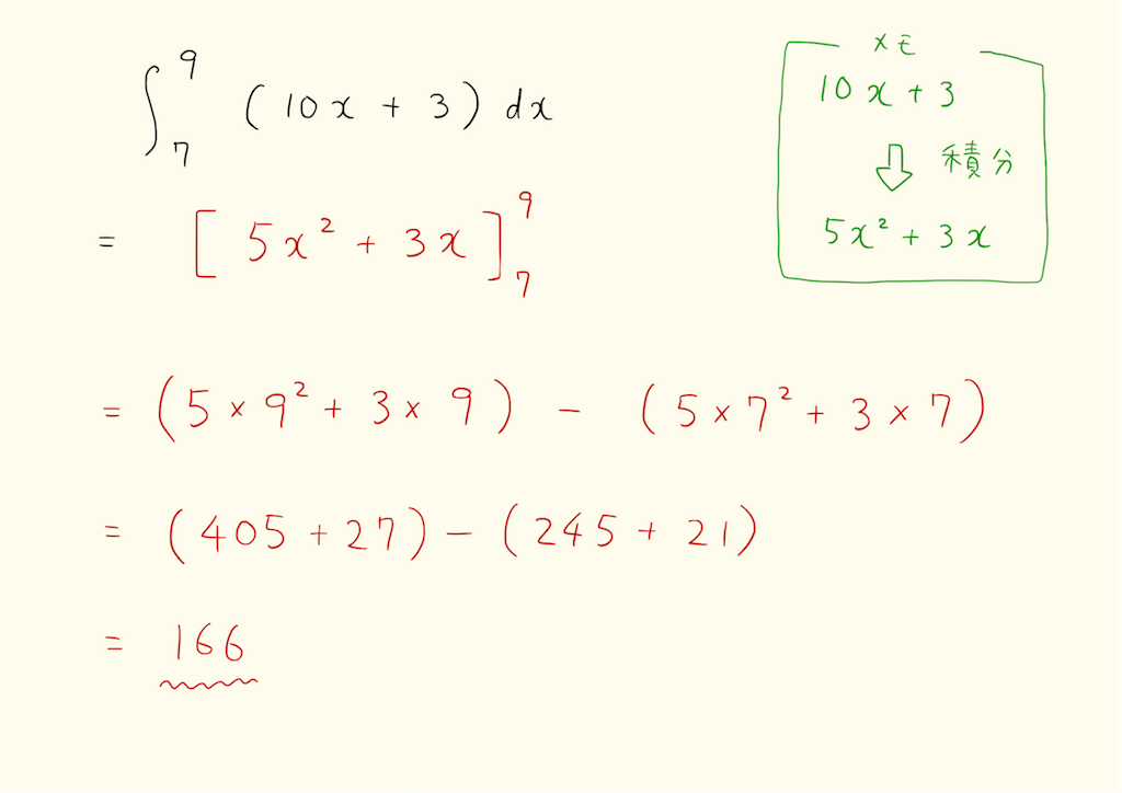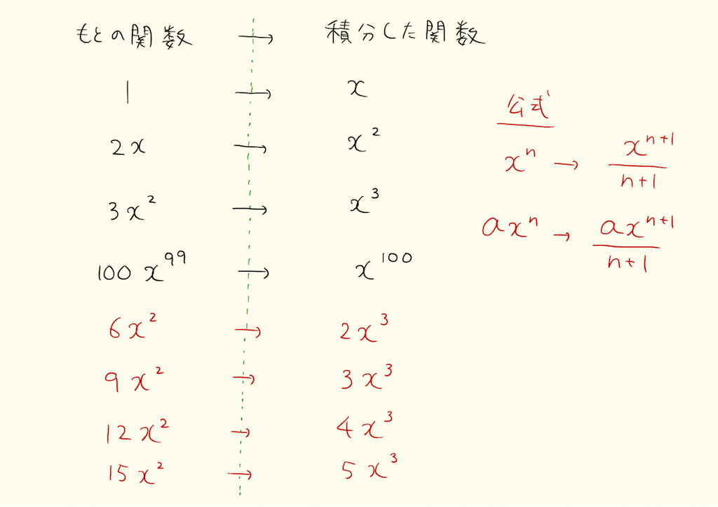 下図を見てください。定数を積分すると一次関数、一次関数を積分すると二次関数、99次関数を積分すると100次関数になっています。赤字で書かれている公式のとおり、x^nを積分すると係数はn+1の逆数になります。積分するときは係数の計算が大変です。