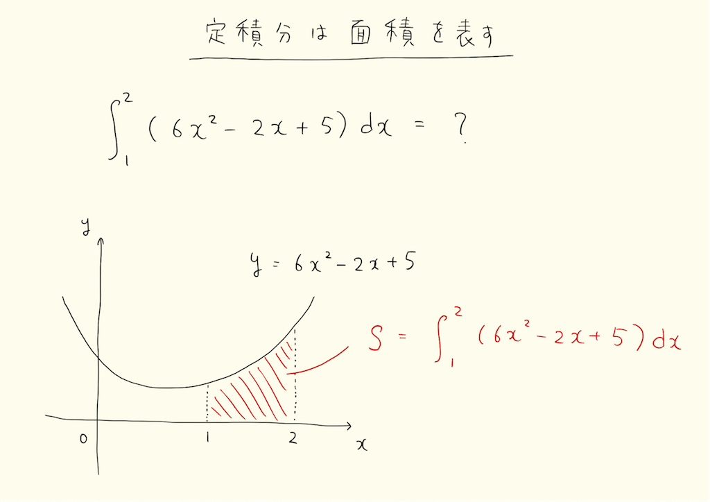 積分記号の上下に数字が添えられた積分を定積分といいます。これは積分したい範囲を指定するときに使います。不定積分すると関数が出てきますが、定積分は値が出てきます。