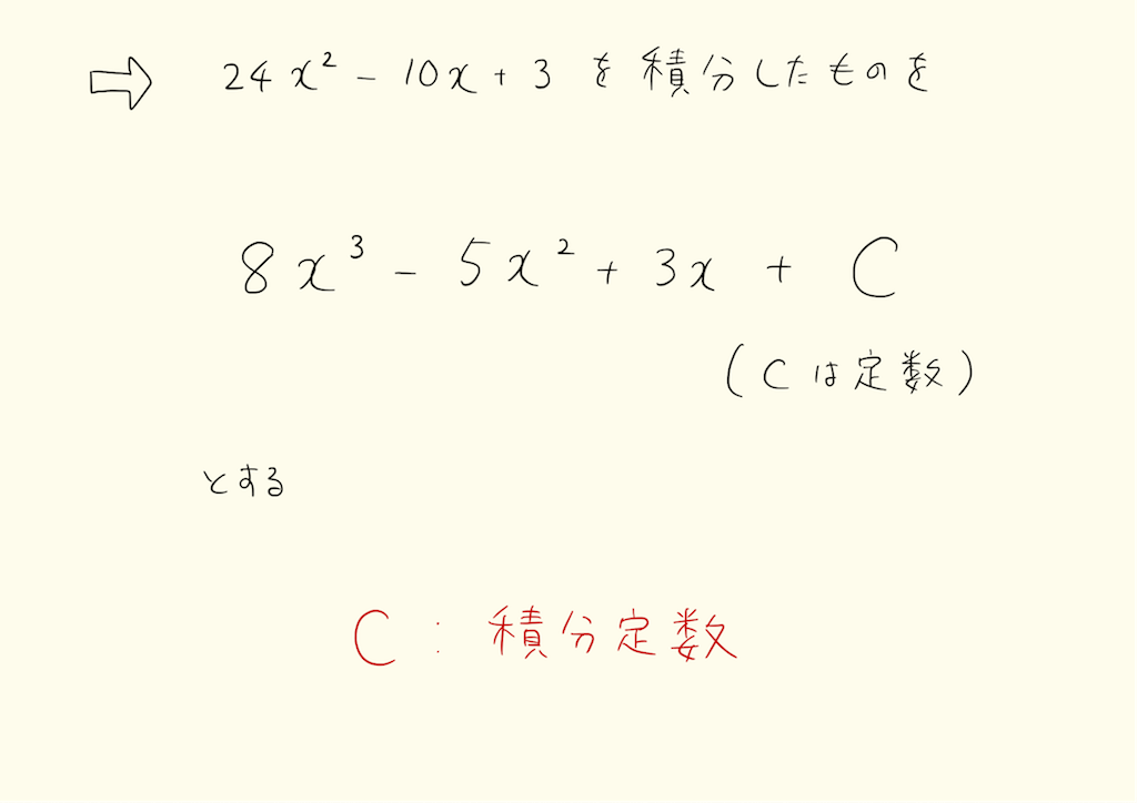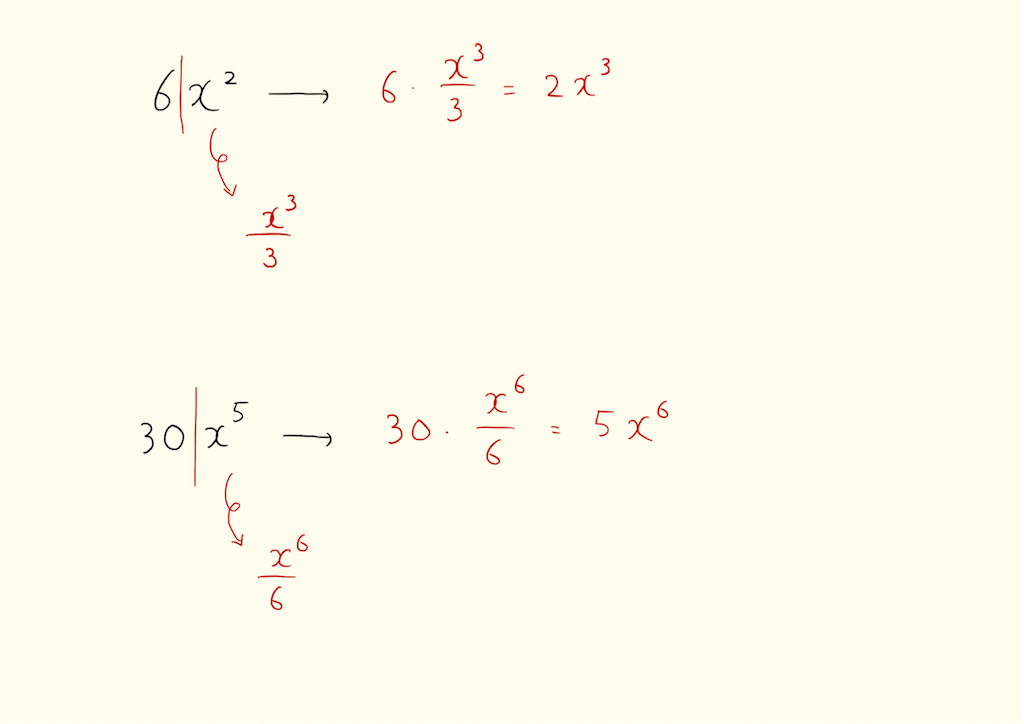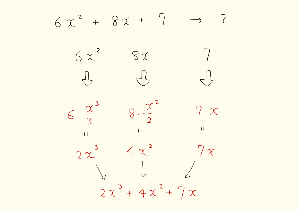 x^nの積分がわかったら、続いて多項式の積分を計算しましょう。それぞれの項を積分して後で足すだけです。