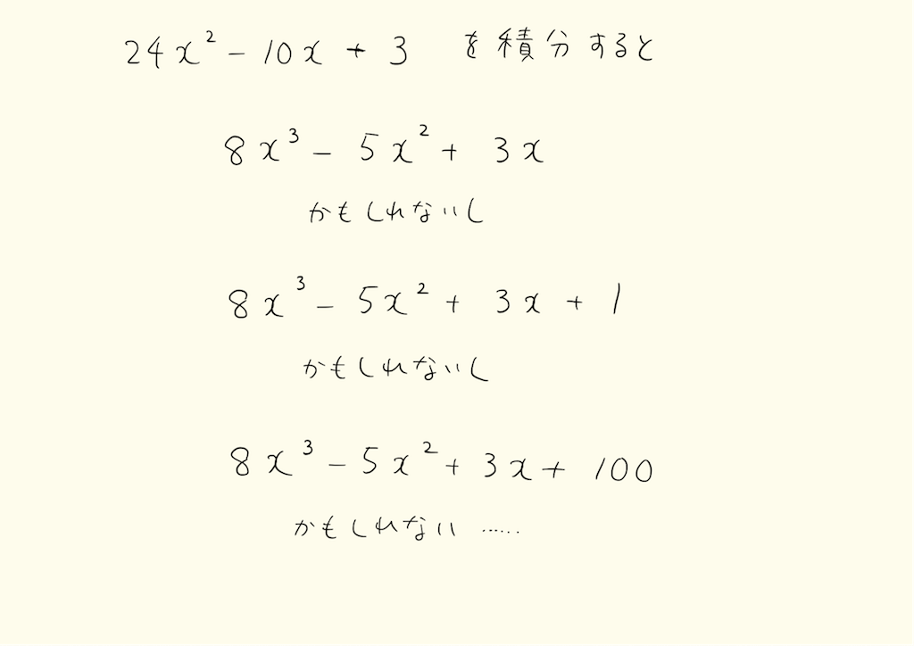 定積分は不定積分が土台になっているため、正しい定積分の値を求めるときは不定積分が正しいかきちんと確かめよう。