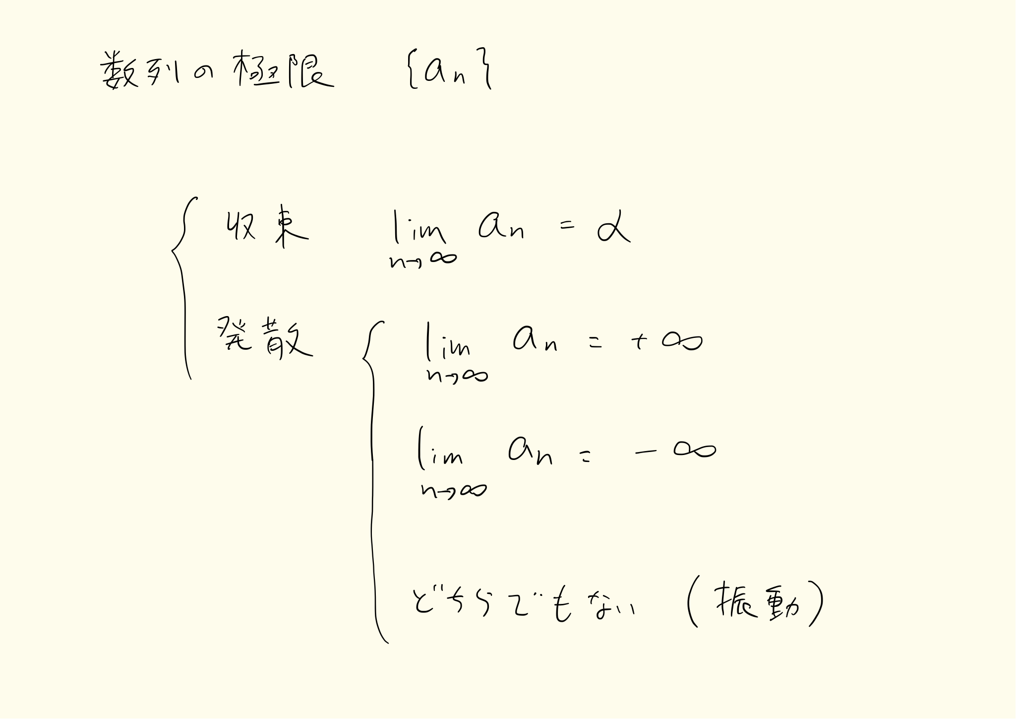 数列は一定の値に収束するか、無限に発散するか、いつまでも不安定な値をとり続けるかの三パターンあります。特に三番目のパターンを振動といいます。