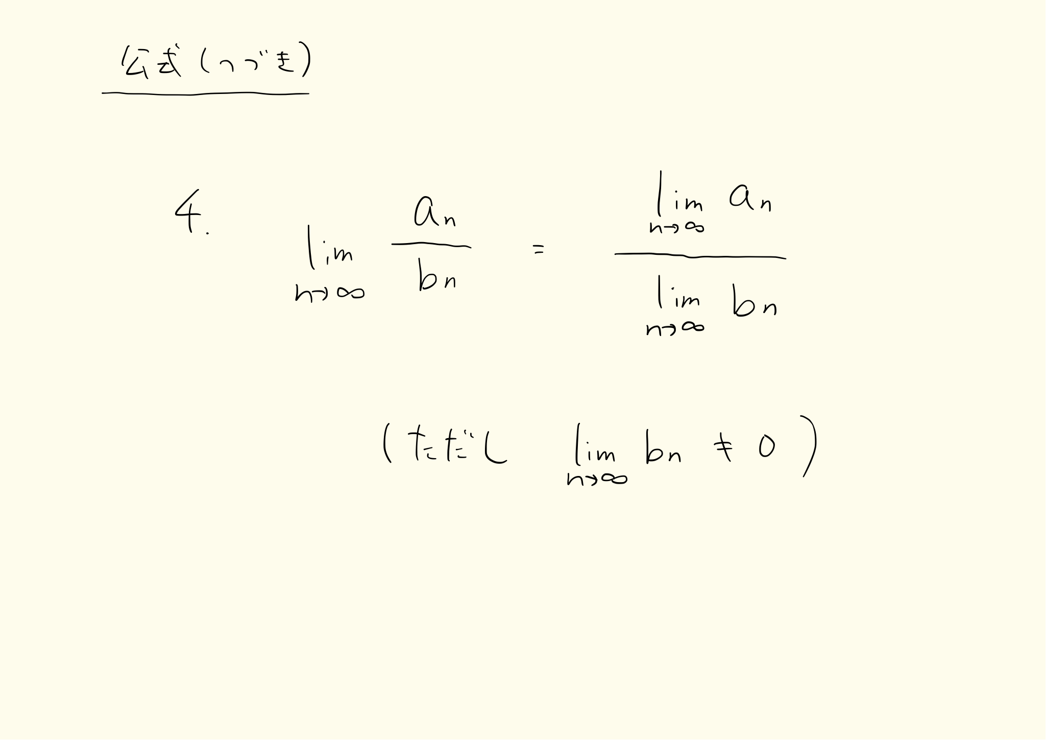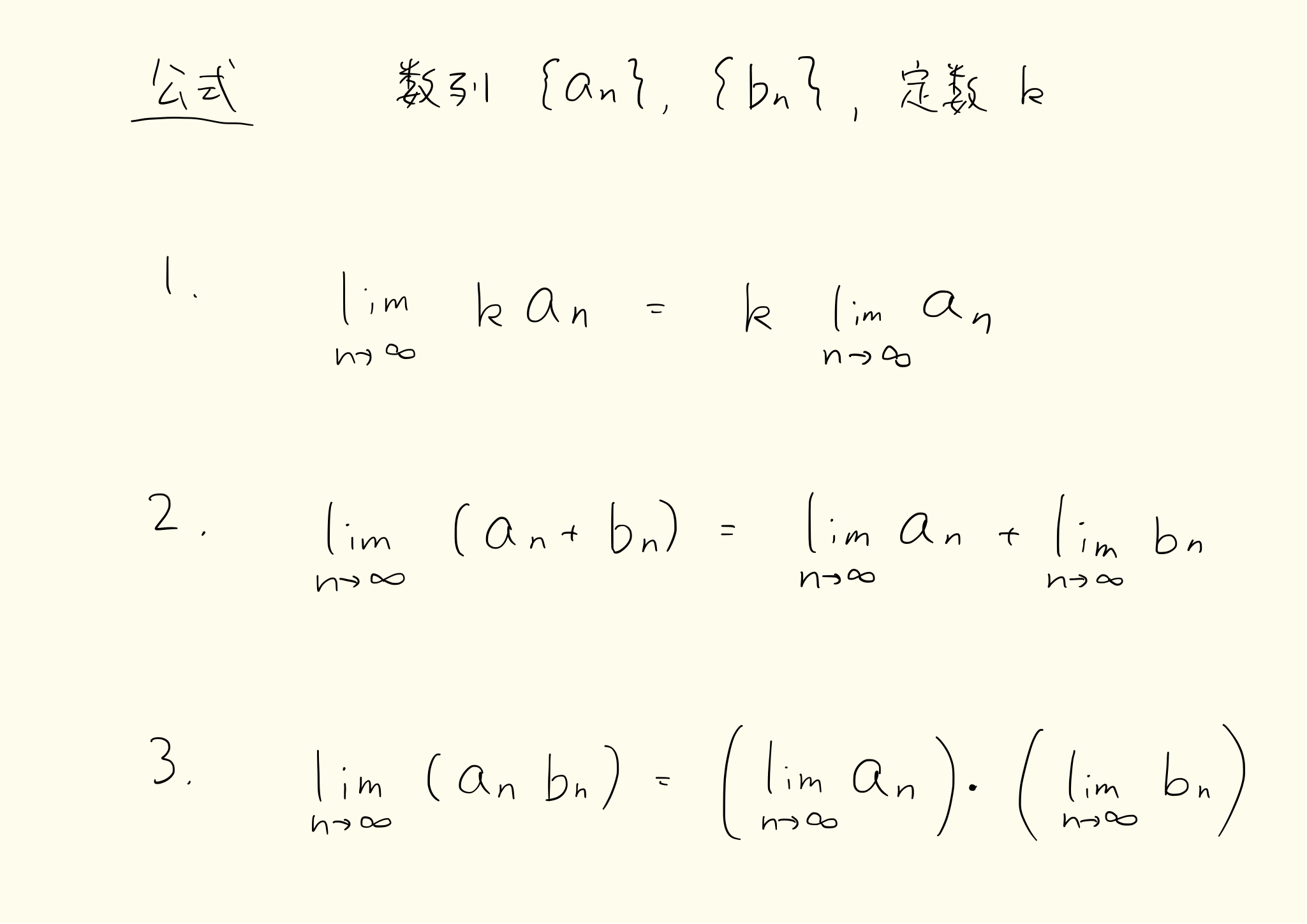 足し算やかけ算をしてから極限をとった値と、極限をとって足し算やかけ算をした値が一致します。この性質を使ってさまざまな数列の極限を求めることができます。