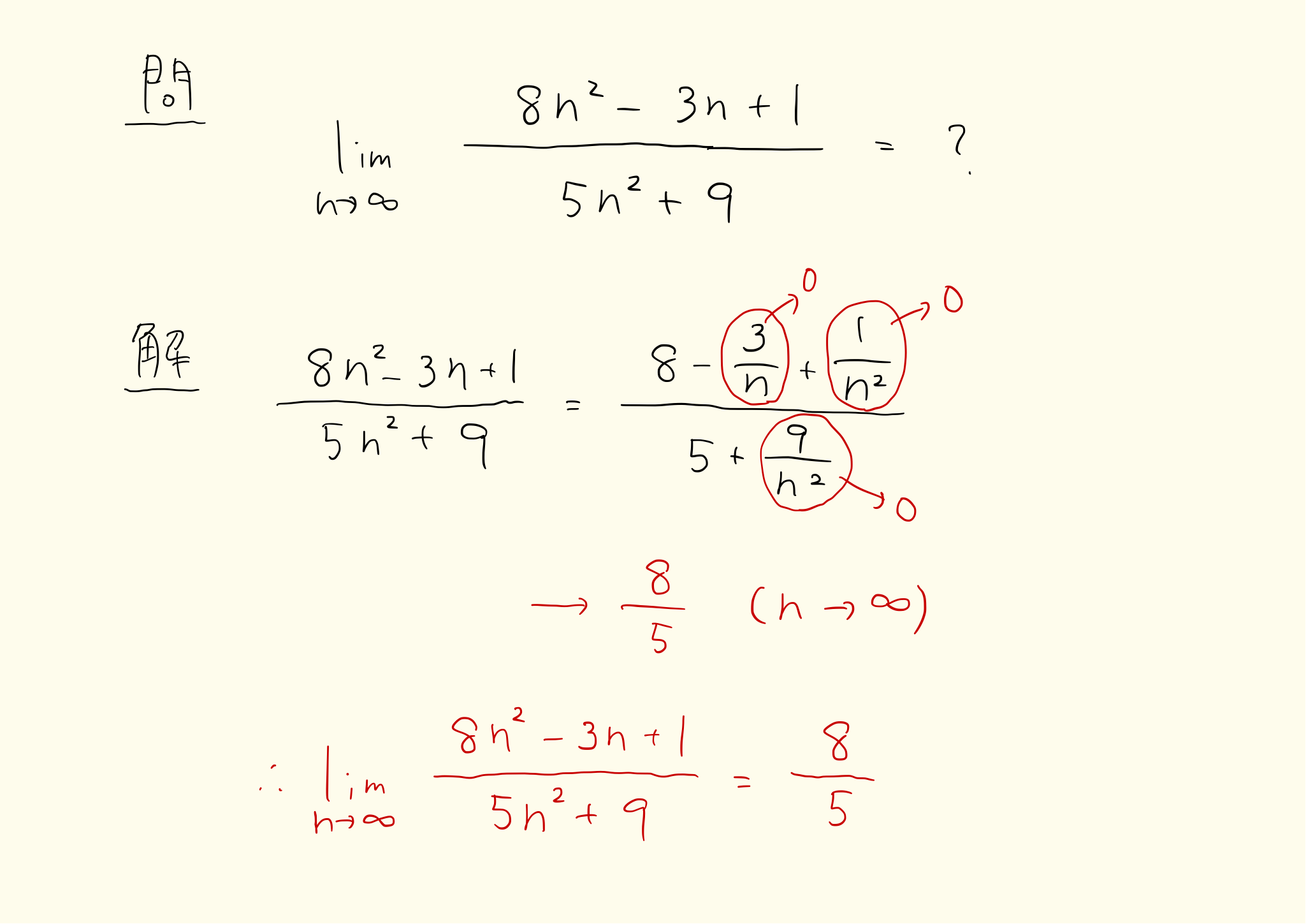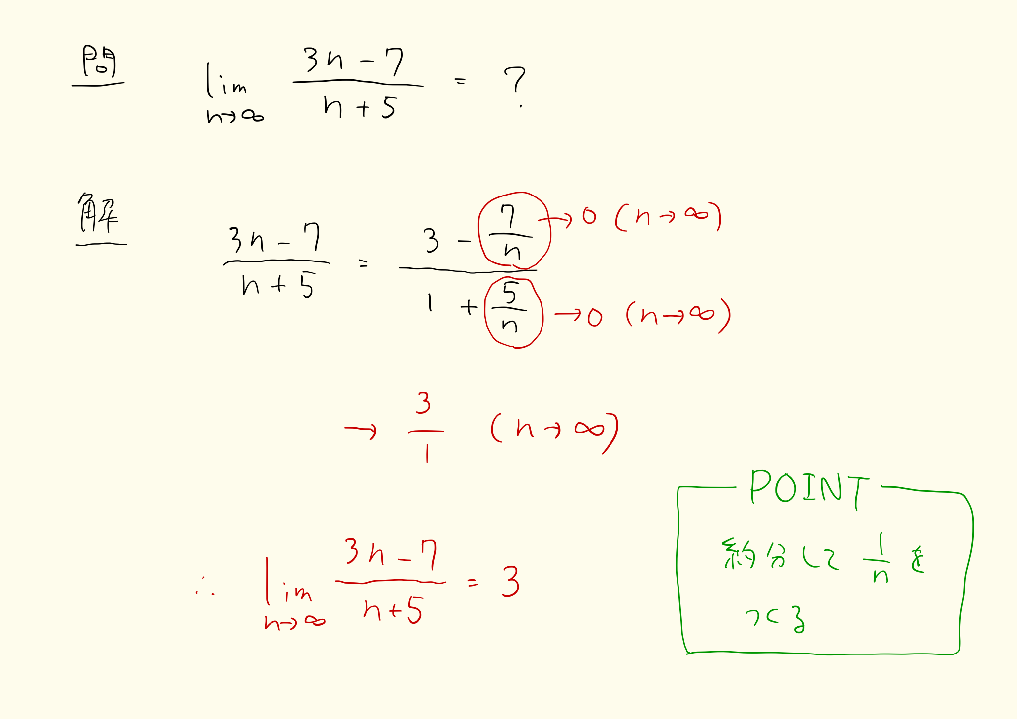 極限の問題は1/nをつくることが基本です。数列の形が分数になっているタイプは、分母と分子をnなどで約分してn以上の項(n^2、n^3…)を消し、1/n以下の項(1/n、1/n^2、1/n^3…)をつくることで極限を求めます。