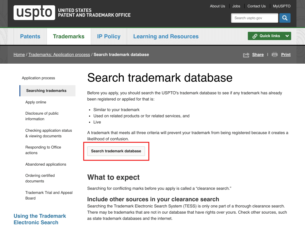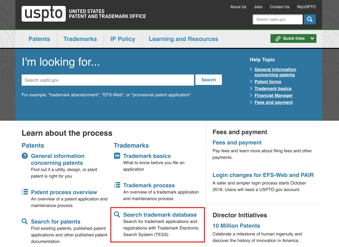 アメリカの商標登録は United States Patent and Trademark Office で確認できる。トップページから Search trademark database を探してクリック(下図の赤線)。