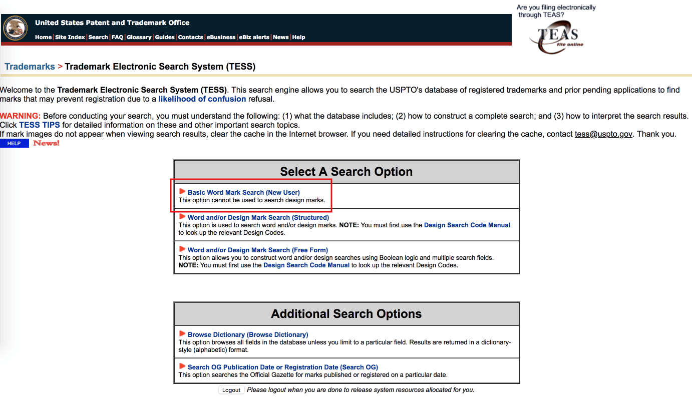 TESS では画面中央の Basic Word Mark Search (New User) をクリック(下図の赤線)。