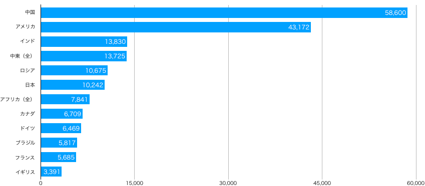 発電量は中国、アメリカ、インド、ロシア、日本の順に多くなっています。