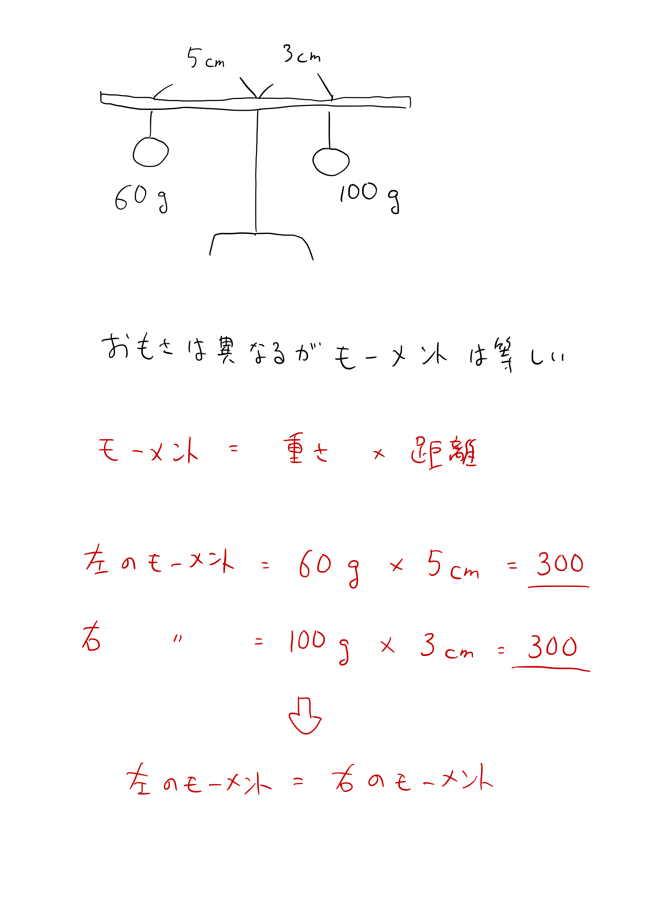 重さと距離をかけた値をモーメントといいます。てこがつり合っている時、左右のモーメントは等しくなっています。
