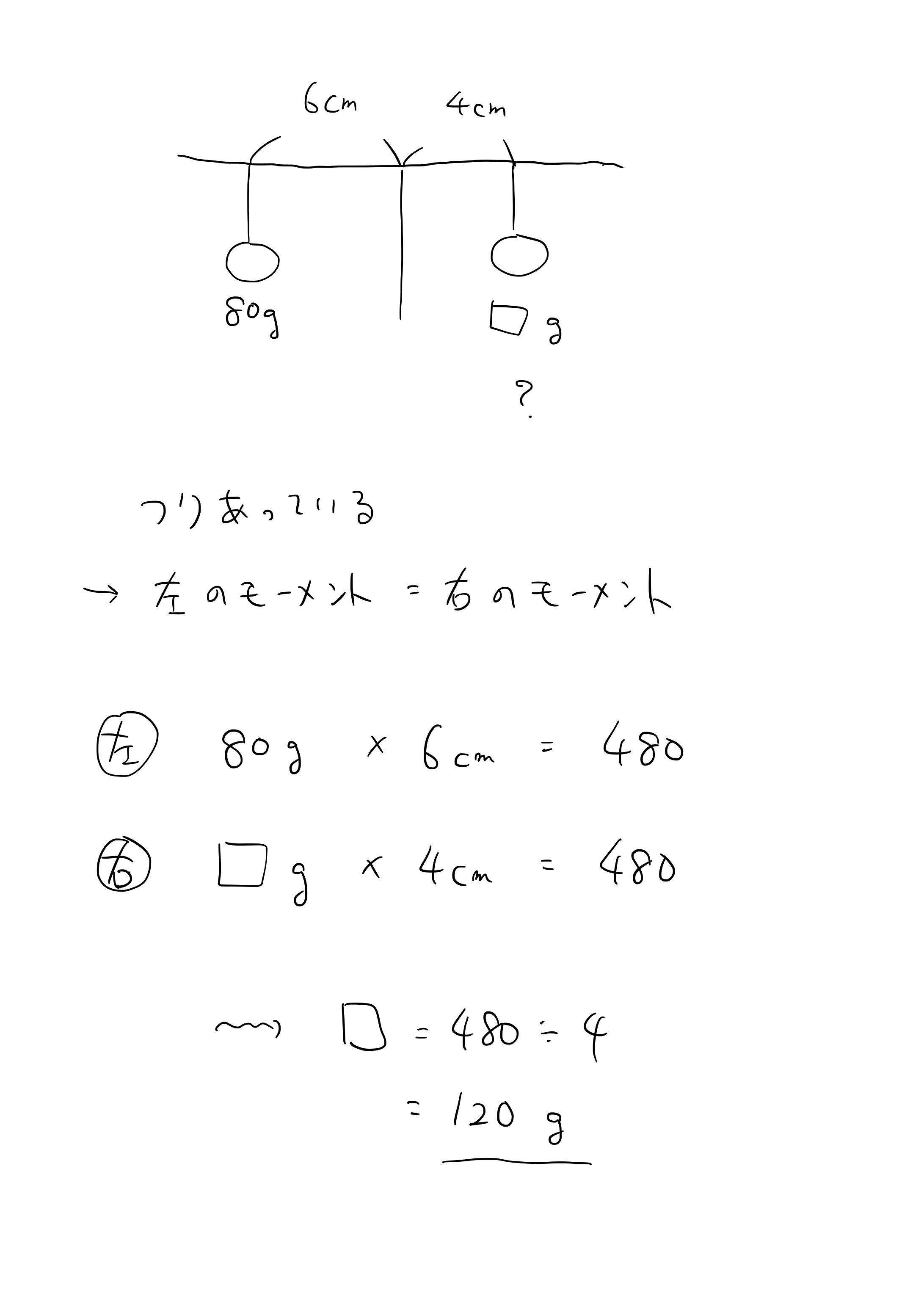 左に80gのおもりをぶら下げて、右にある重さのおもりをぶら下げた。左のおもりは支点から6cmのところにぶら下がり、右は4cmのところにぶら下がっている。右につるされたおもりは何gか?