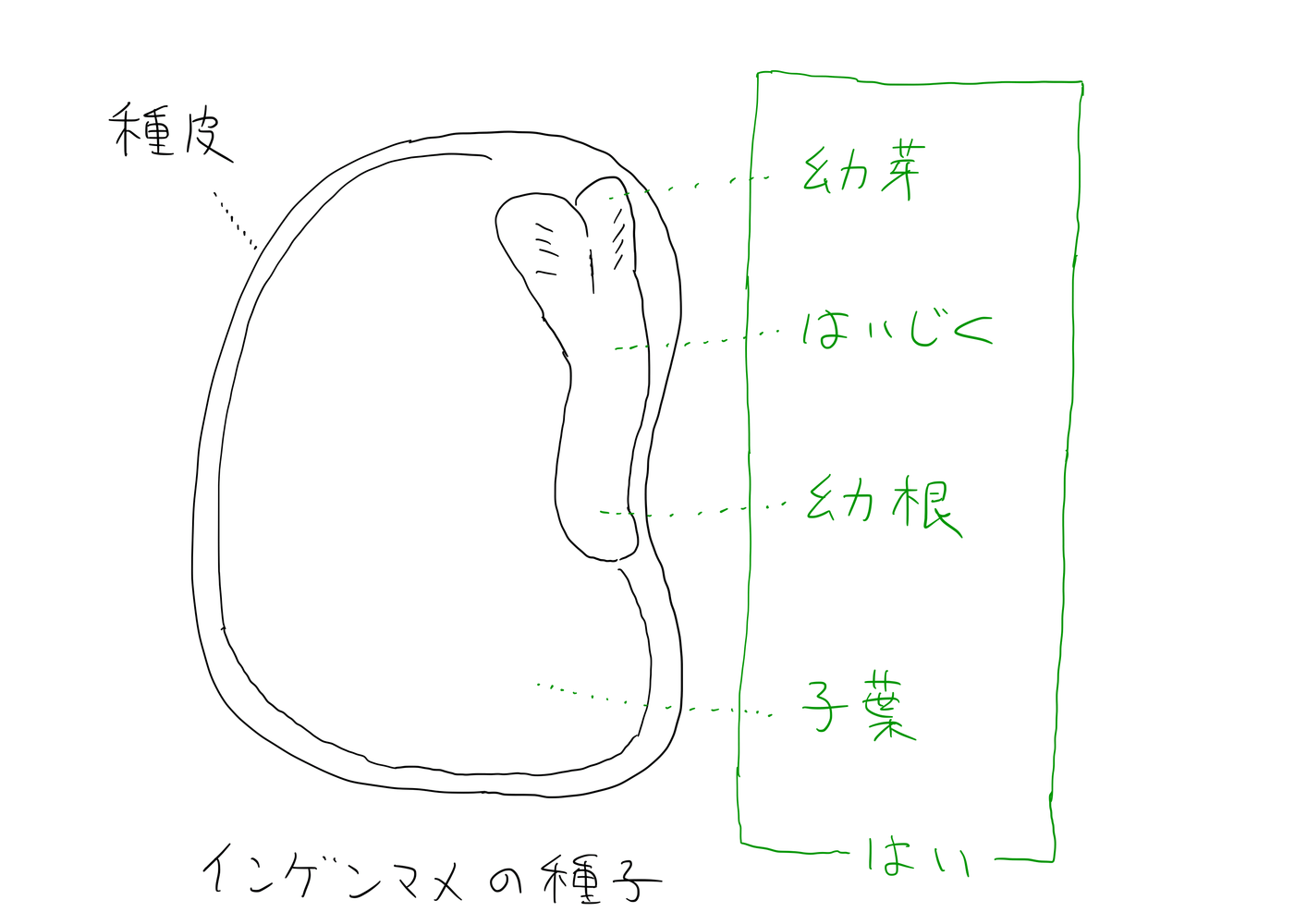 インゲンマメの「はい」は幼芽、はいじく、幼根、子葉の四つでできています。