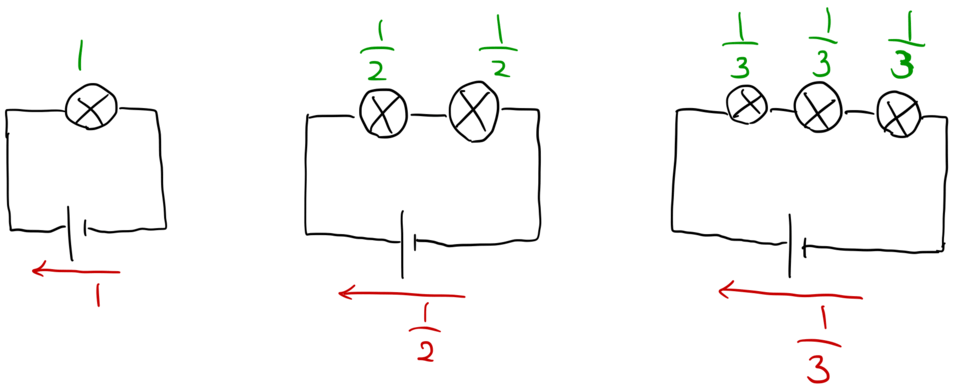 電球の直列つなぎでは、電球を増やすと電球の明るさがどんどん暗くなります。電球が 2 個のとき、明るさは 1/2 になります。