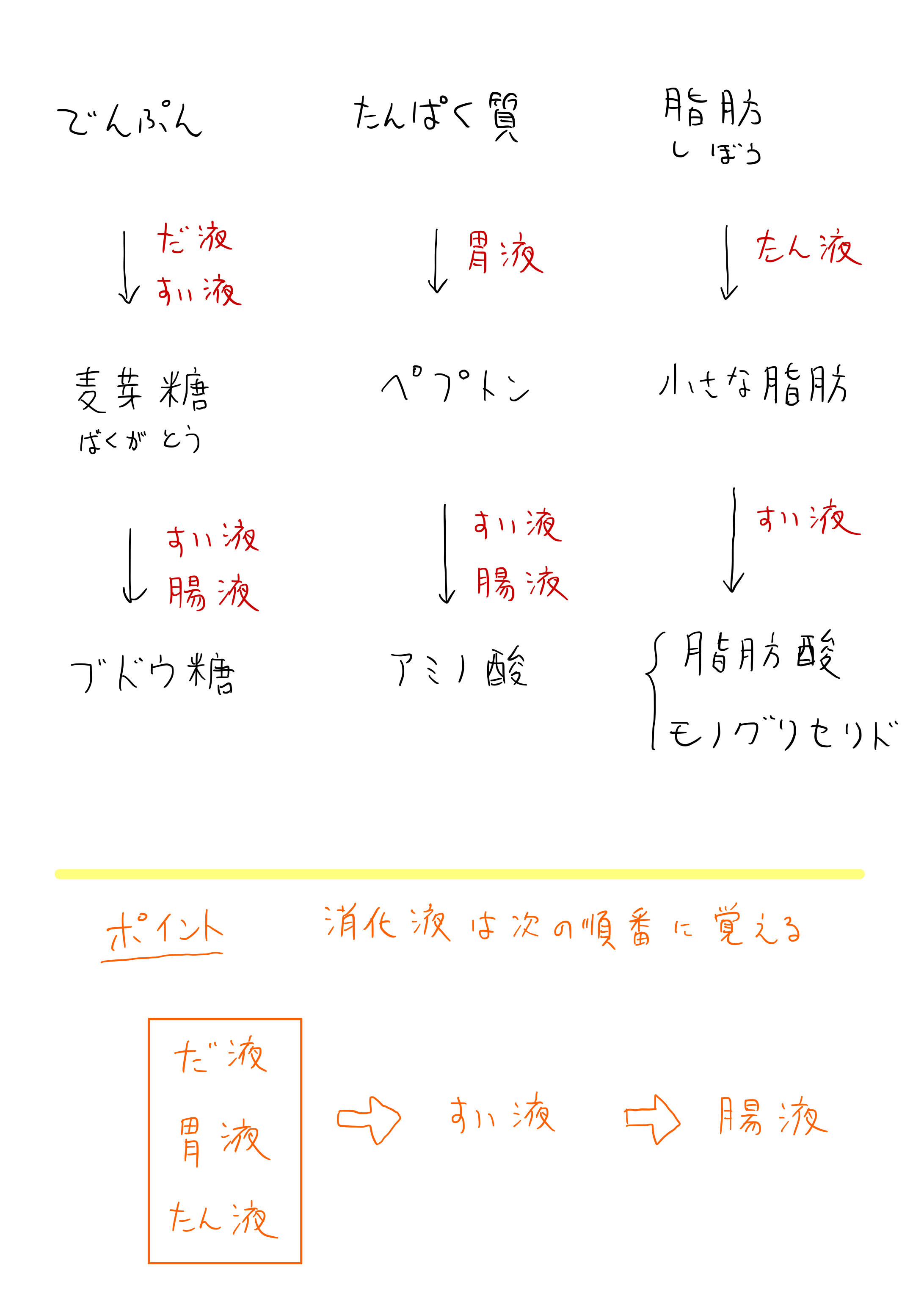 - 消化液から覚える … だ液、胃液、たん液などをまず覚える