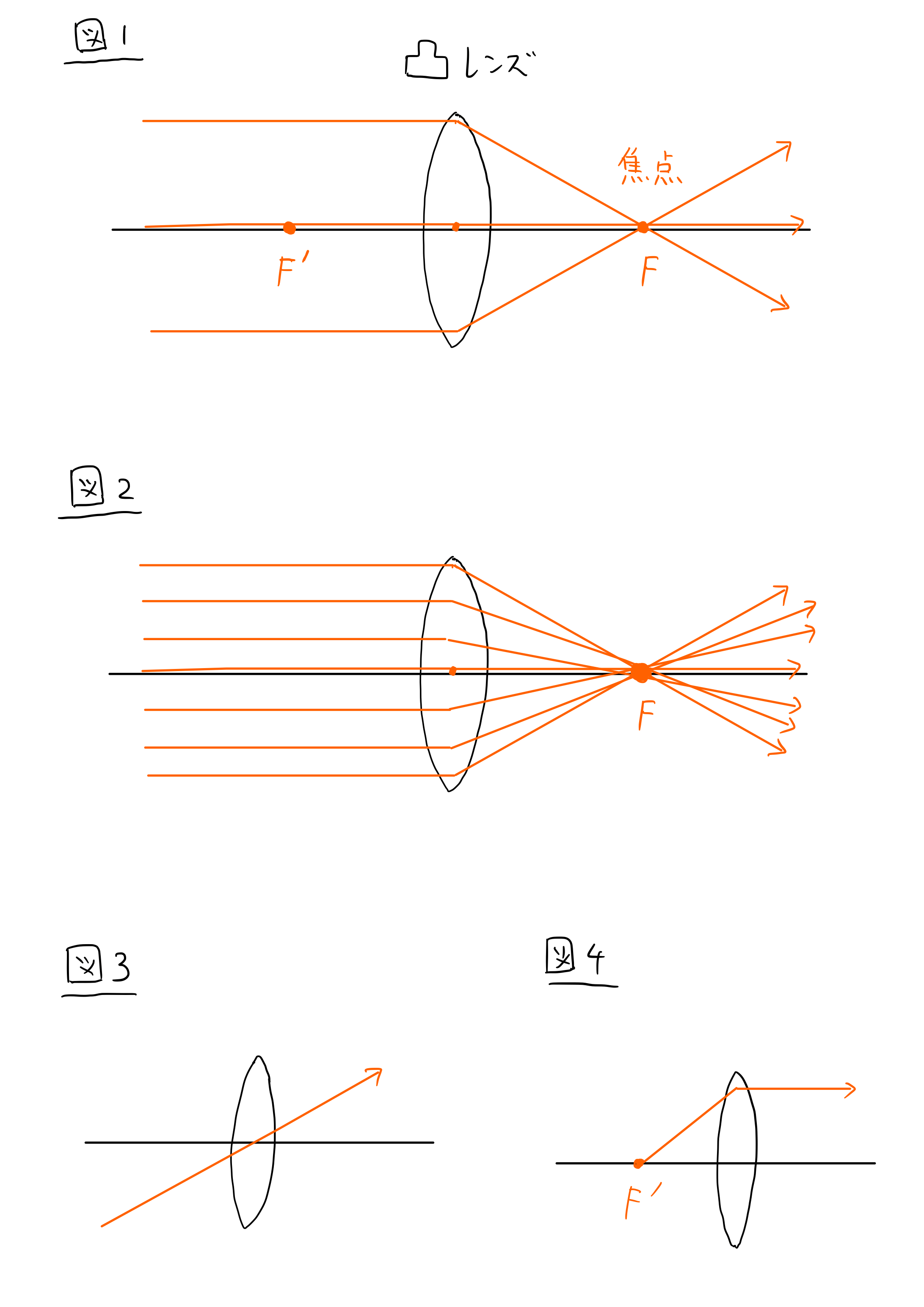 図1を見てください。日光は凸レンズの軸と並行に入り、レンズを通って焦点に集まっています。図2ではたくさんの光が描いてありますね。
