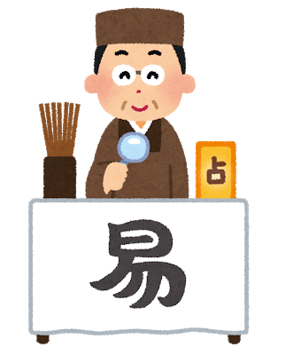 ↑の左にある棒を「めどぎ」という。昔は蓍という植物を使って占っていたので、「占い」そのものを蓍と言う場合もあります。後に蓍は竹になり、棒は筮竹と呼ばれるようになりました。