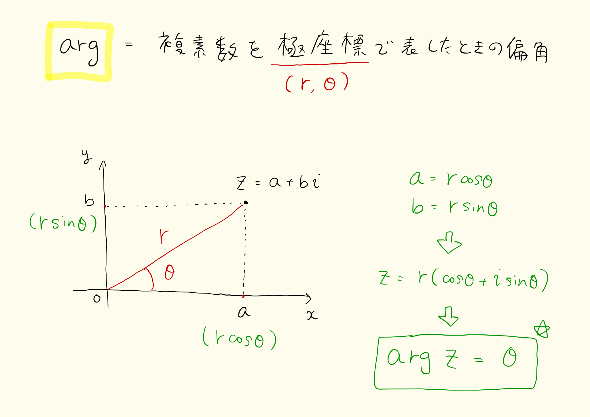 このとき θ を z の偏角といい,arg で表す.
