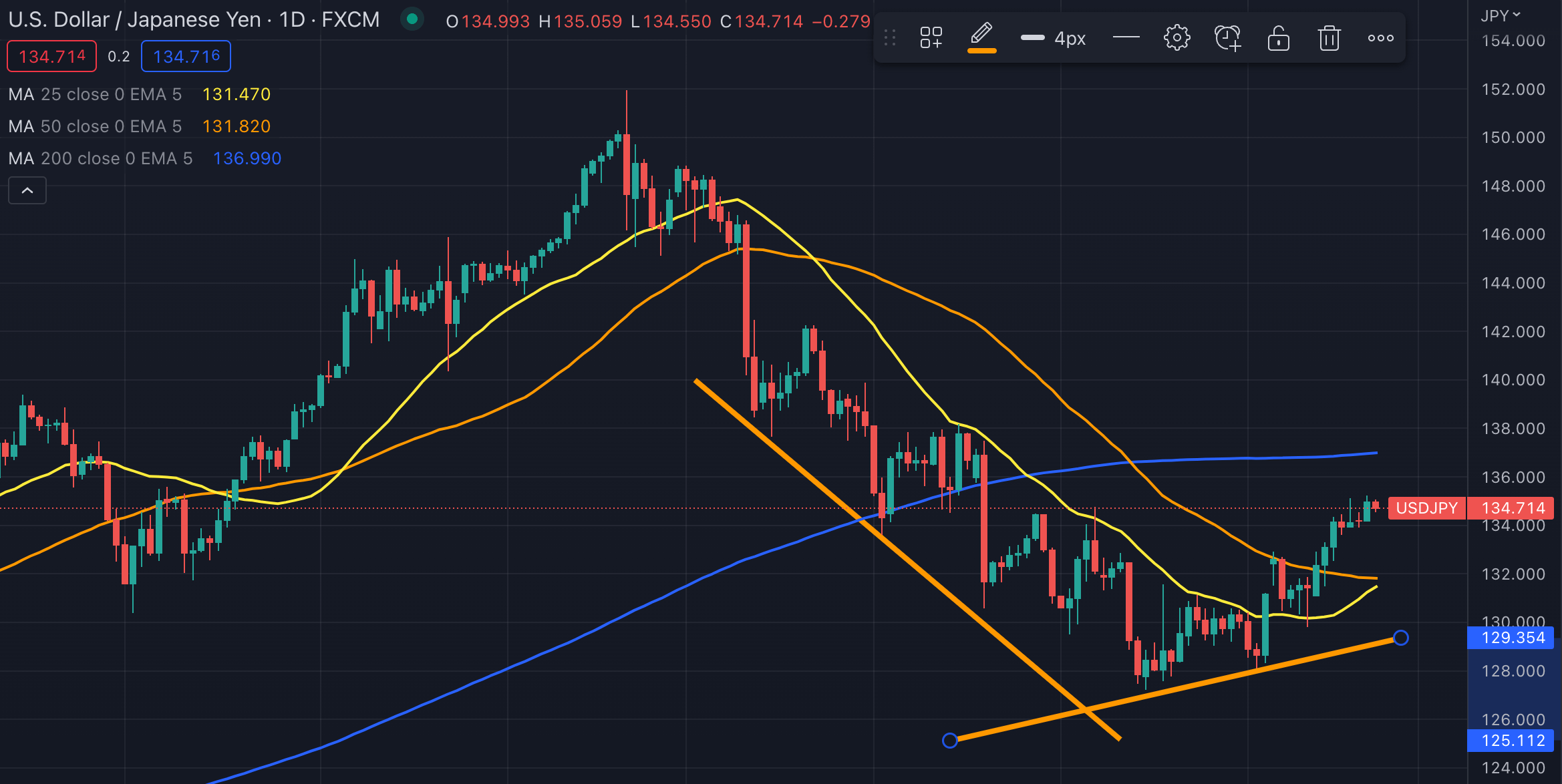 日足では短期移動平均線が中期移動平均線に交わろうとしています。アメリカの強い需要でインフレーションの収束が長引くという観測があるためです。0.25% の利上げは 2 回ではすまないという空気もある。