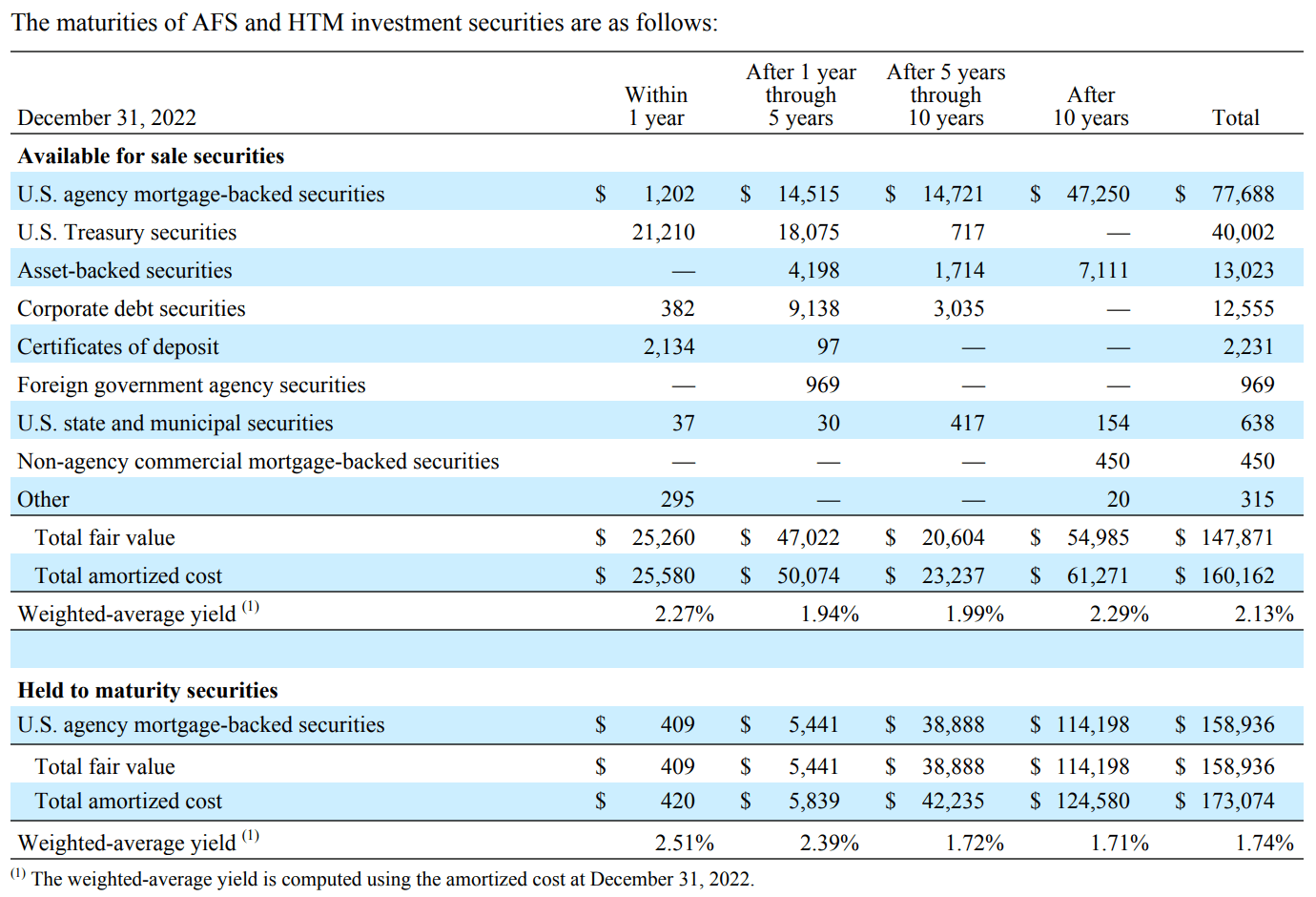 Held to maturity は満期保有の意味で、公正価値でなく償却原価法によって計上されます。シリコンバレー銀行はこの満期保有目的有価証券の割合が大きすぎたことも問題だったかも。Charles Schwab は AFS と HTM がだいたい同じ。