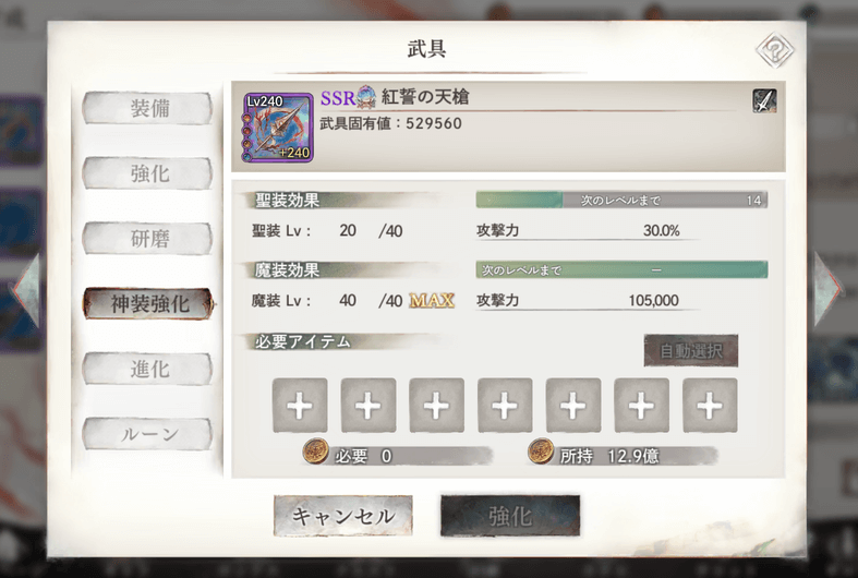 神装強化では武具の聖装レベルと魔装レベルを上げます。あー混乱してきますね。そして「聖装武具」は聖装レベルを上げるものです。