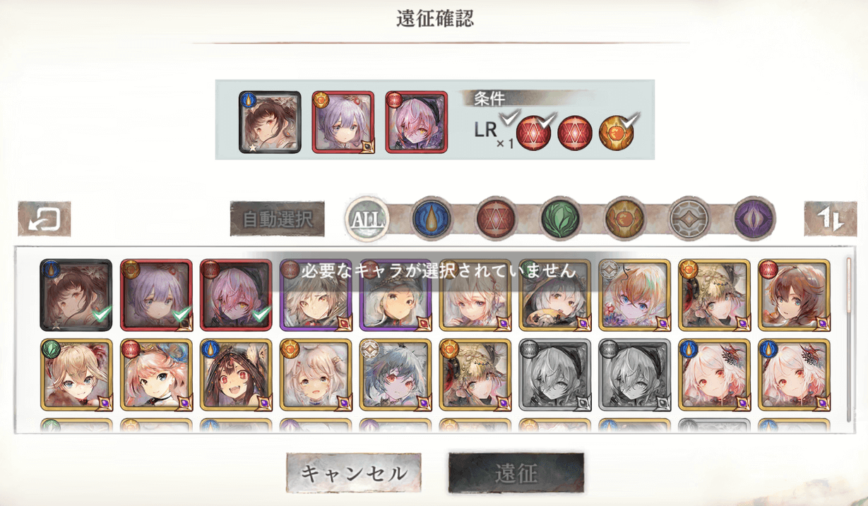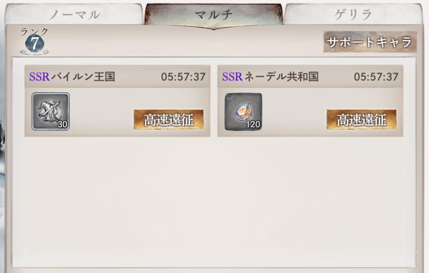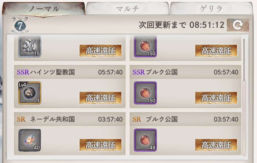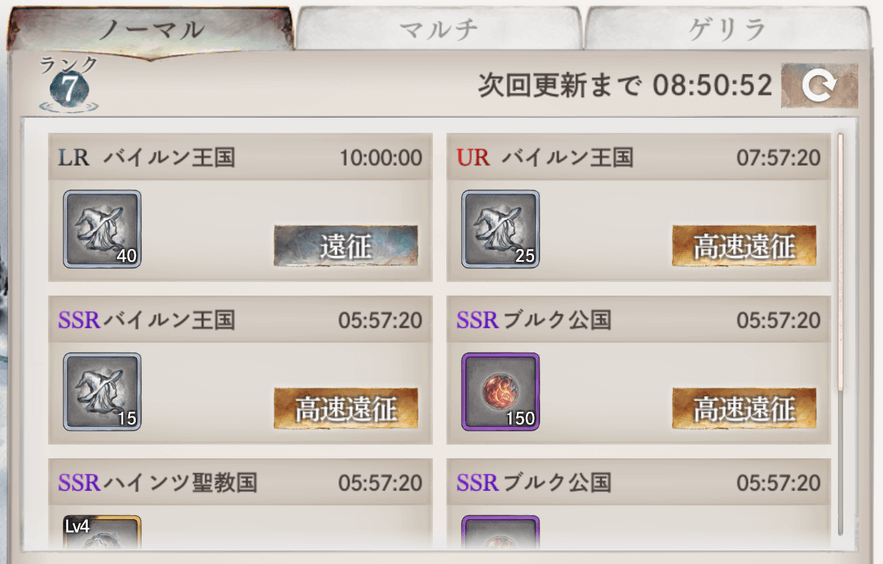 祈りの泉はやればやるほどランクが上がっていくけど、ちょっと注意点があります。一番目の画像を見てわかるように、最初バイルン王国だけ「遠征」になっています。遠征できないのは、赤LRをもってないからです。