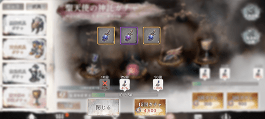 聖天使の神託ガチャは天契の聖杯といったレアなアイテムの獲得が目標です。ガチャを引くと、10 回目で 20%、25 回目で 40%、50 回目で 100% の確率できます。要するに天井ガチャです。