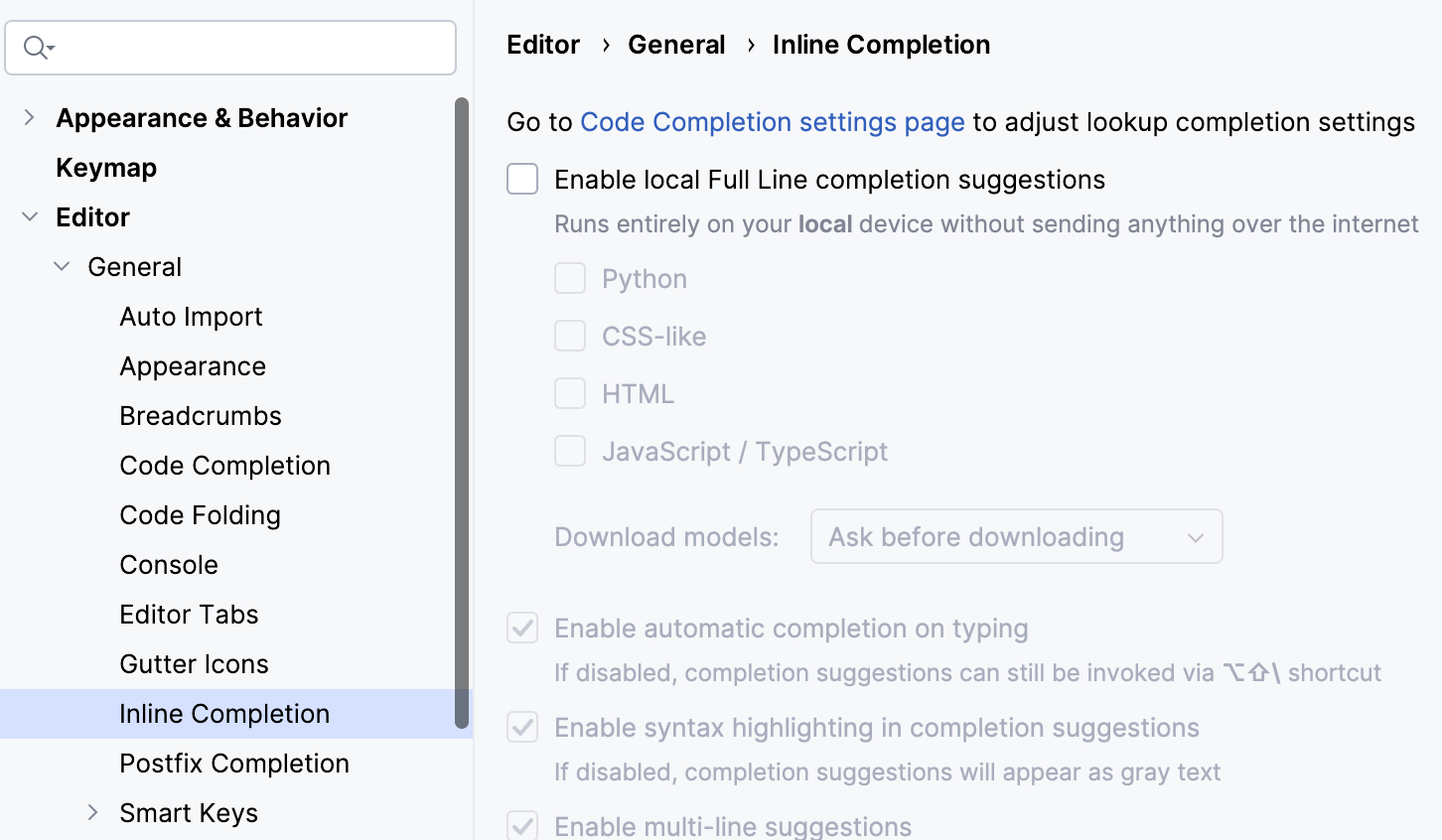 Editor > General > Inline Completion で Enable… のチェックを外すと、コードの曖昧な予測を無効にできます。