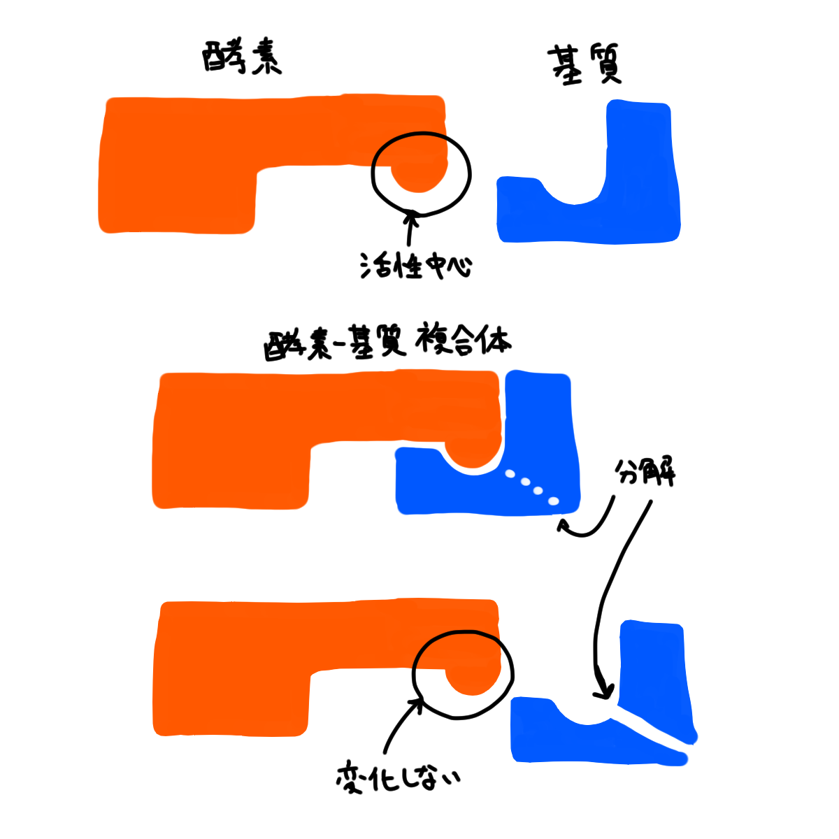 酵素と基質の反応は上の図のように酵素基質複合体を経て進みます。酵素と基質が結合すると基質が分解されます。