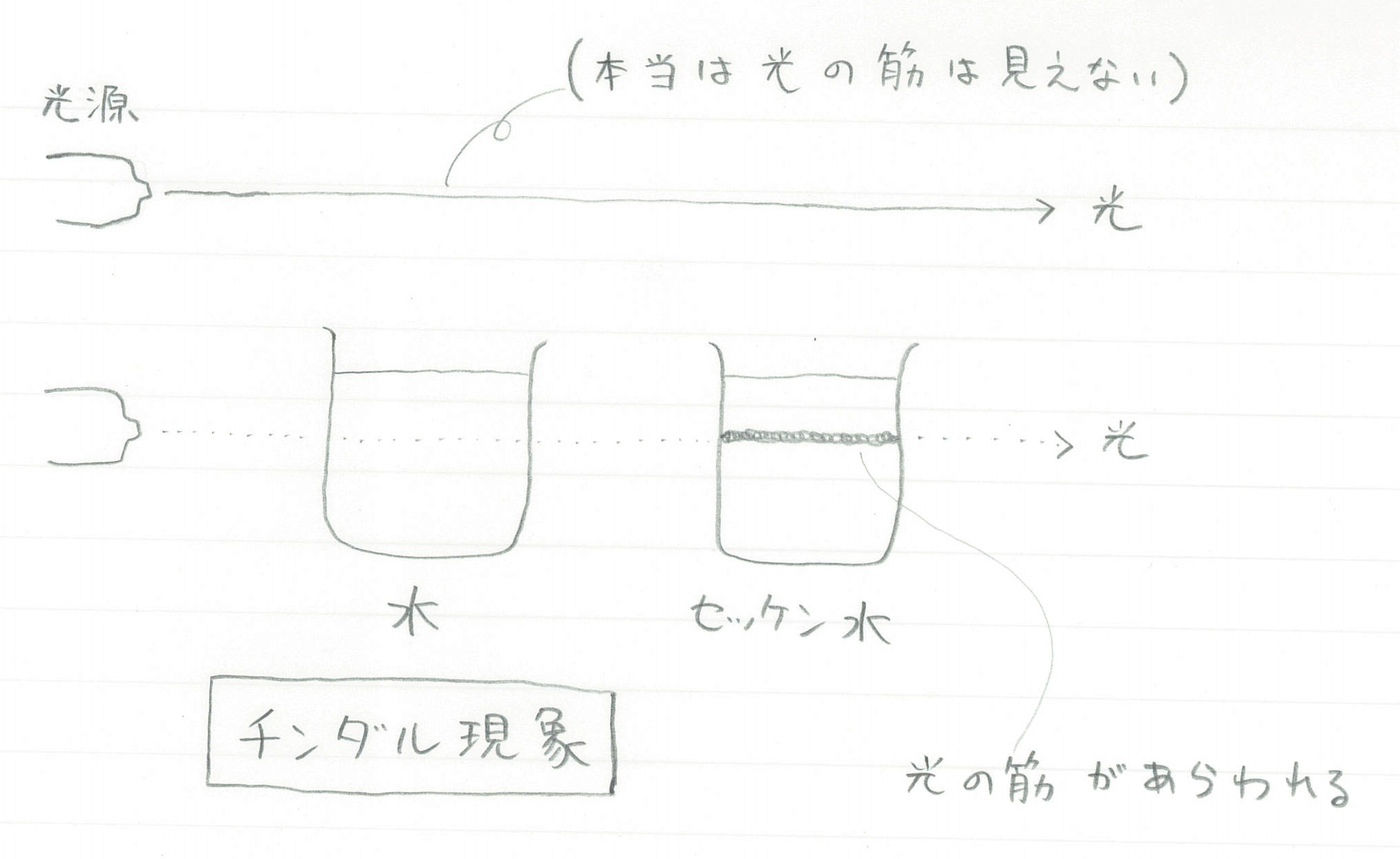 水や水酸化ナトリウム水溶液といった水溶液は光を当ててもその道筋は見えない。しかしコロイド溶液は光を当てるとその道筋がぼんやりと見える。