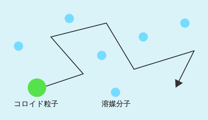 コロイド粒子の不規則な運動をブラウン運動といいます。ブラウン運動は、分散媒の小さな物質がコロイド粒子という巨大な粒子に衝突することで起きます。