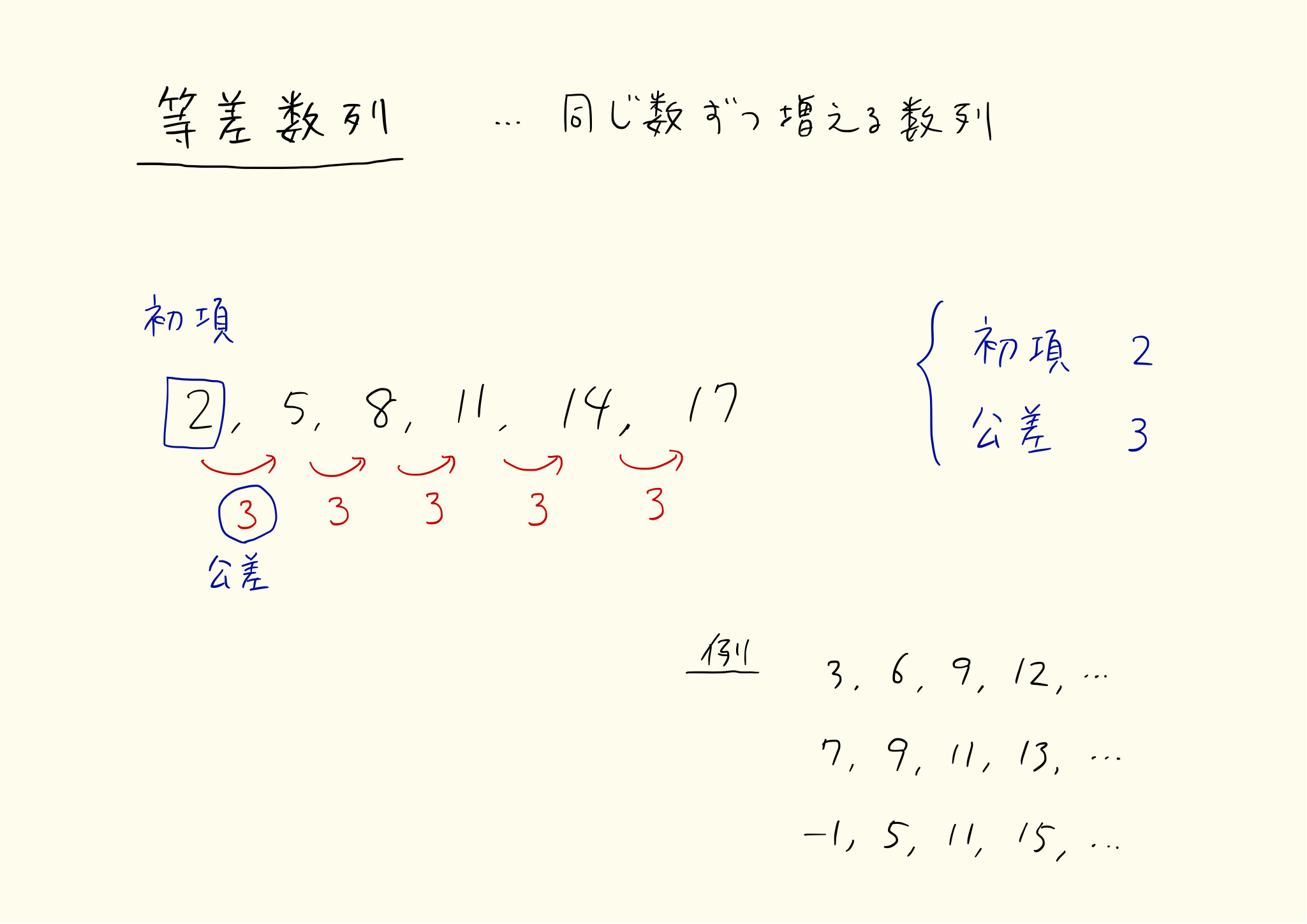 等差数列の最初の数を初項、二つの項の差を公差と呼びます。上の例では初項は2、公差は3です。
