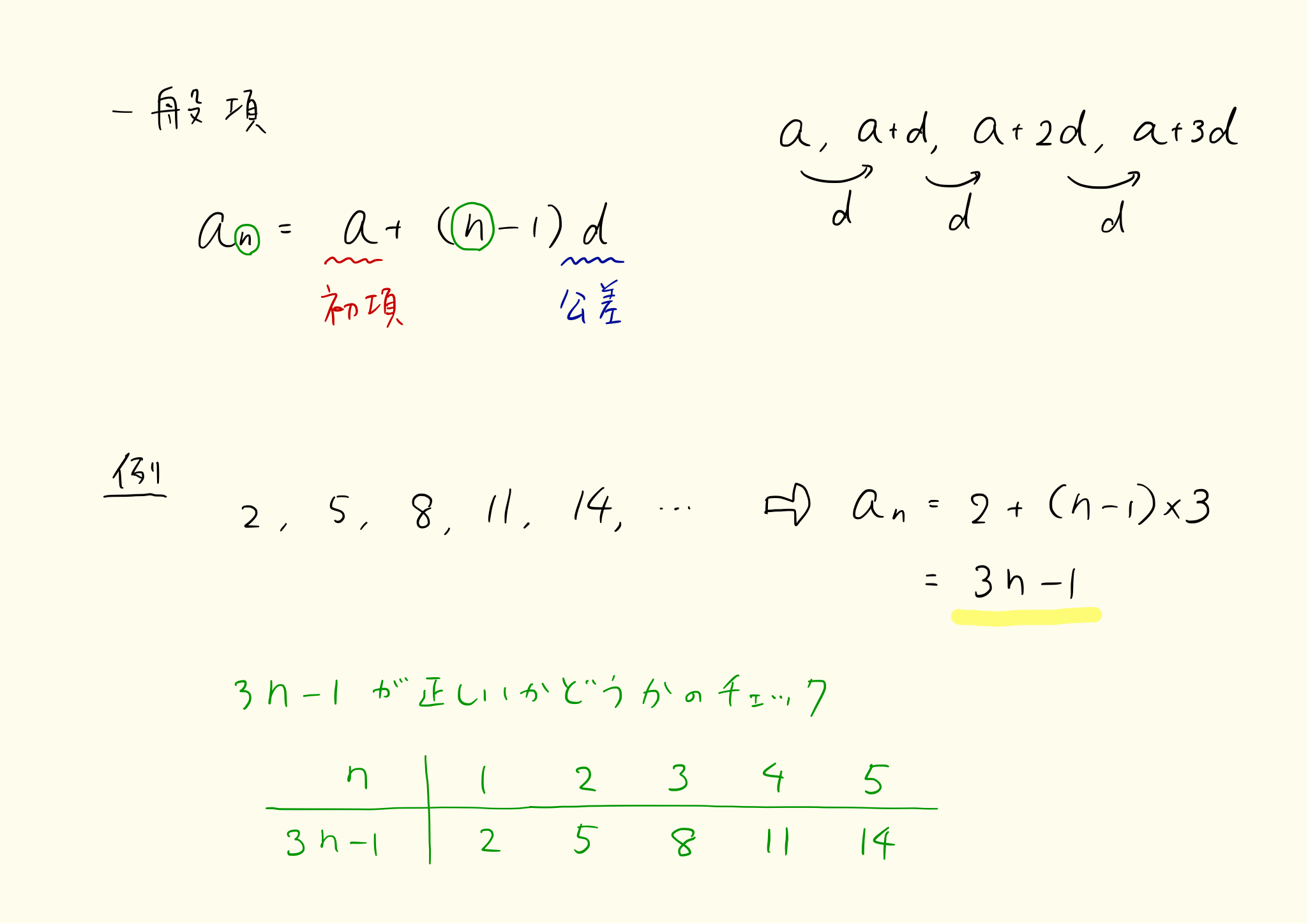 となりますが、この式が実際に正しいことは容易に確かめられます。3n-1のnに1,2,3,4,5を代入すると2,5,8,11,14となり、もとの数列に一致することがわかります。