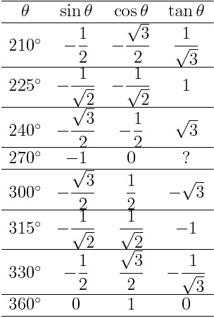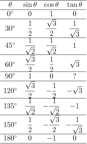 | 角度 | sin | cos | tan |
