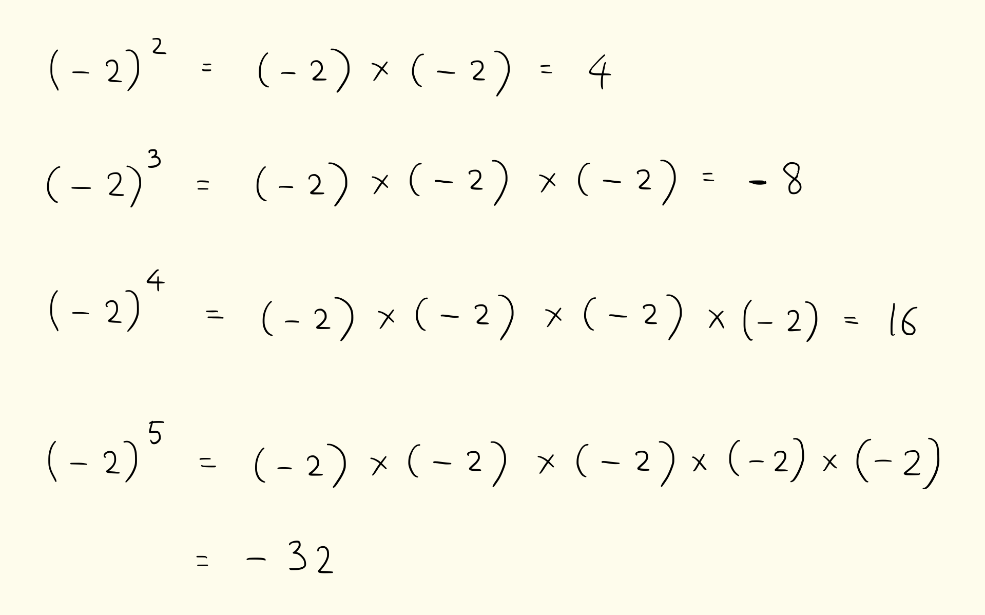 -2の2乗、3乗、4乗を計算すると4、-8、16になります。プラスとマイナスをかけるとマイナス、マイナスとマイナスをかけるとプラスになることに注意しましょう。