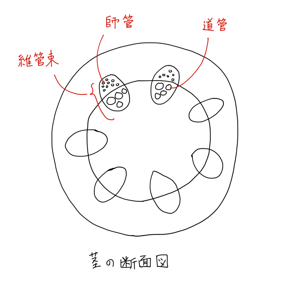 維管束は道管と師管がまとまったもの。双子葉類は維管束が輪を描くように並んでいますが、単子葉類は維管束があちこちに散らばっています。