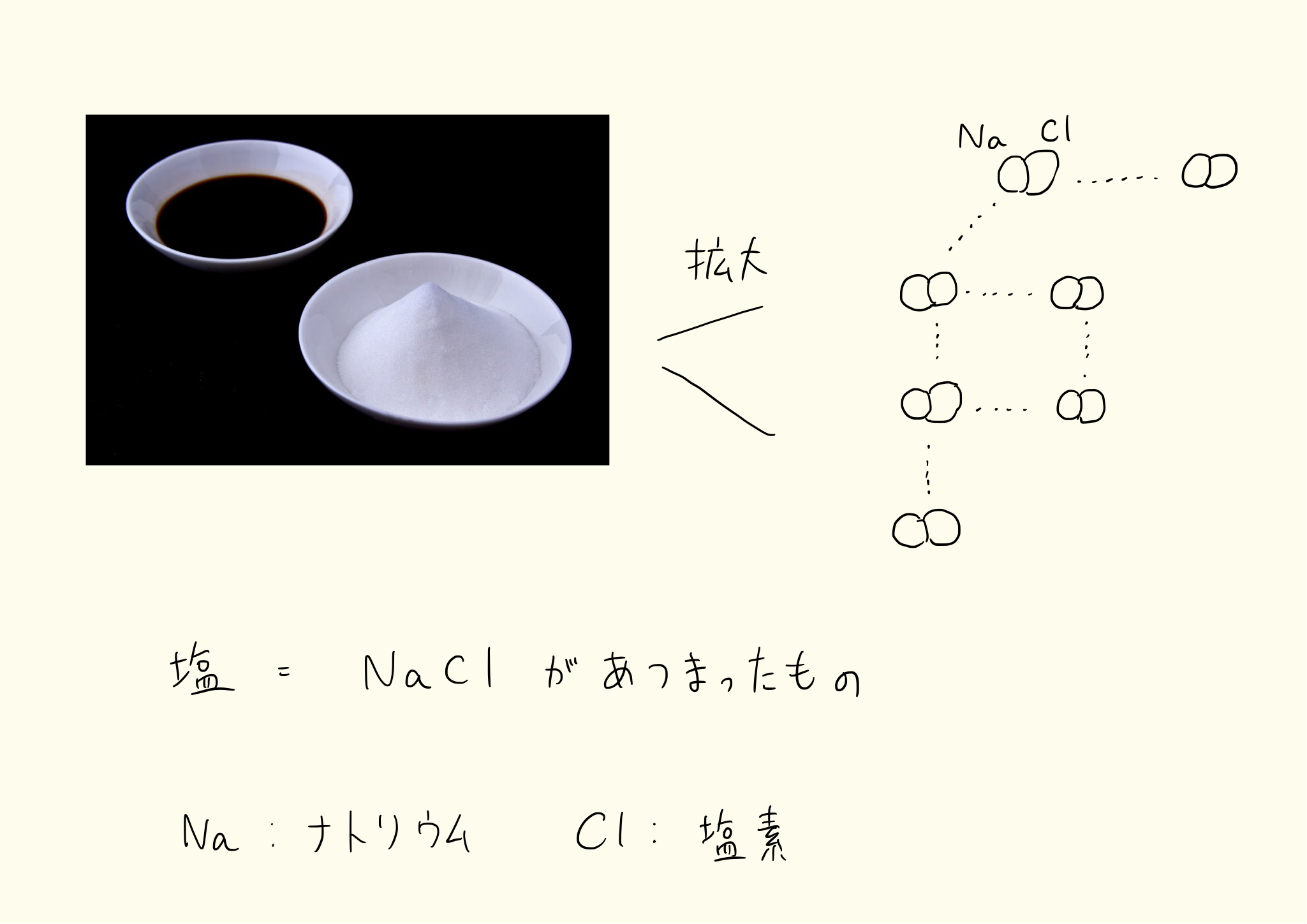 塩化ナトリウムという分子は基本的にパカッと分けることはできない。分けてしまうと、もはやそれは食塩ではないまったく別の物質になってしまう。